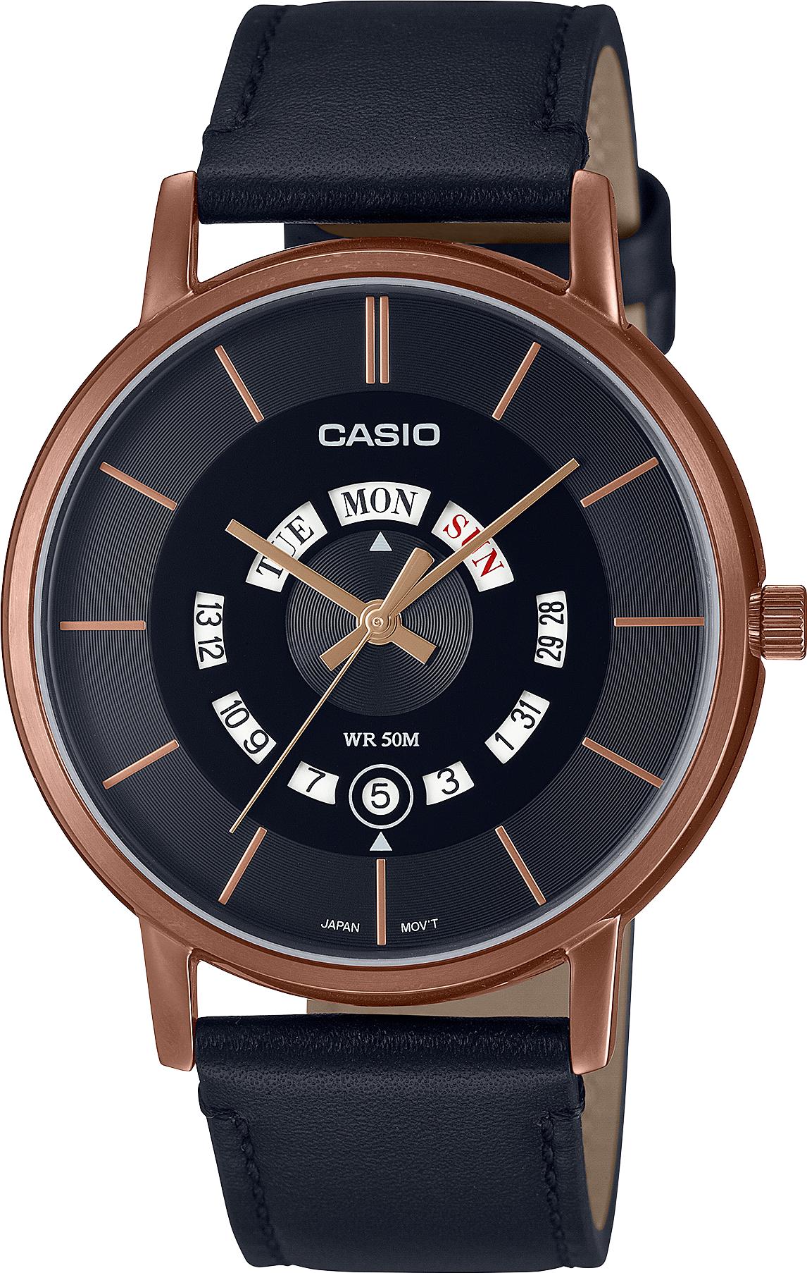 Мужские наручные часы Casio Collection MTP-B135RL-1A. Точный кварцевый механизм с аналоговой индикацией. Ремешок изготовлен из кожи. Аккумулятор обеспечивает часы достаточным питанием приблизительно на 3 года. Браслет из нержавеющей стали. Прочное, устойчивое к царапинам минеральное стекло защищает часы от повреждений. На циферблате отображается текущее число месяца и день недели. Часы являются водонепроницаемыми до 5 Бар. Цвет циферблата: Розовое золото. Цвет корпуса: Черный. Толщина: 8 мм. Гарантия: 2 года.