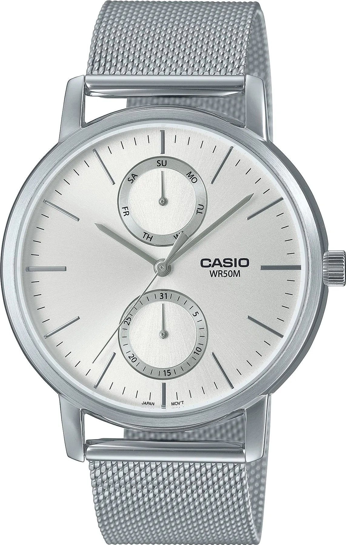 Мужские наручные часы Casio Collection MTP-B310M-7A. Точный кварцевый механизм с аналоговой индикацией. Корпус изготовлен из высококачественной нержавеющей стали 316L с высокими антикоррозийными свойствами. На циферблате отображается текущее число месяца и день недели. Аккумулятор обеспечивает часы достаточным питанием приблизительно на 3 года. Браслет из нержавеющей стали. Прочное, устойчивое к царапинам минеральное стекло защищает часы от повреждений. Часы являются водонепроницаемыми до 5 Бар. Цвет корпуса: Серебристый. Цвет циферблата: Серебристый. Ширина (с заводной головкой): 42мм. Толщина: 8мм. Гарантия: 2 года. Другие наименования модели: MTP-B310M-7AVEF, MTP-B310M-7AVD.