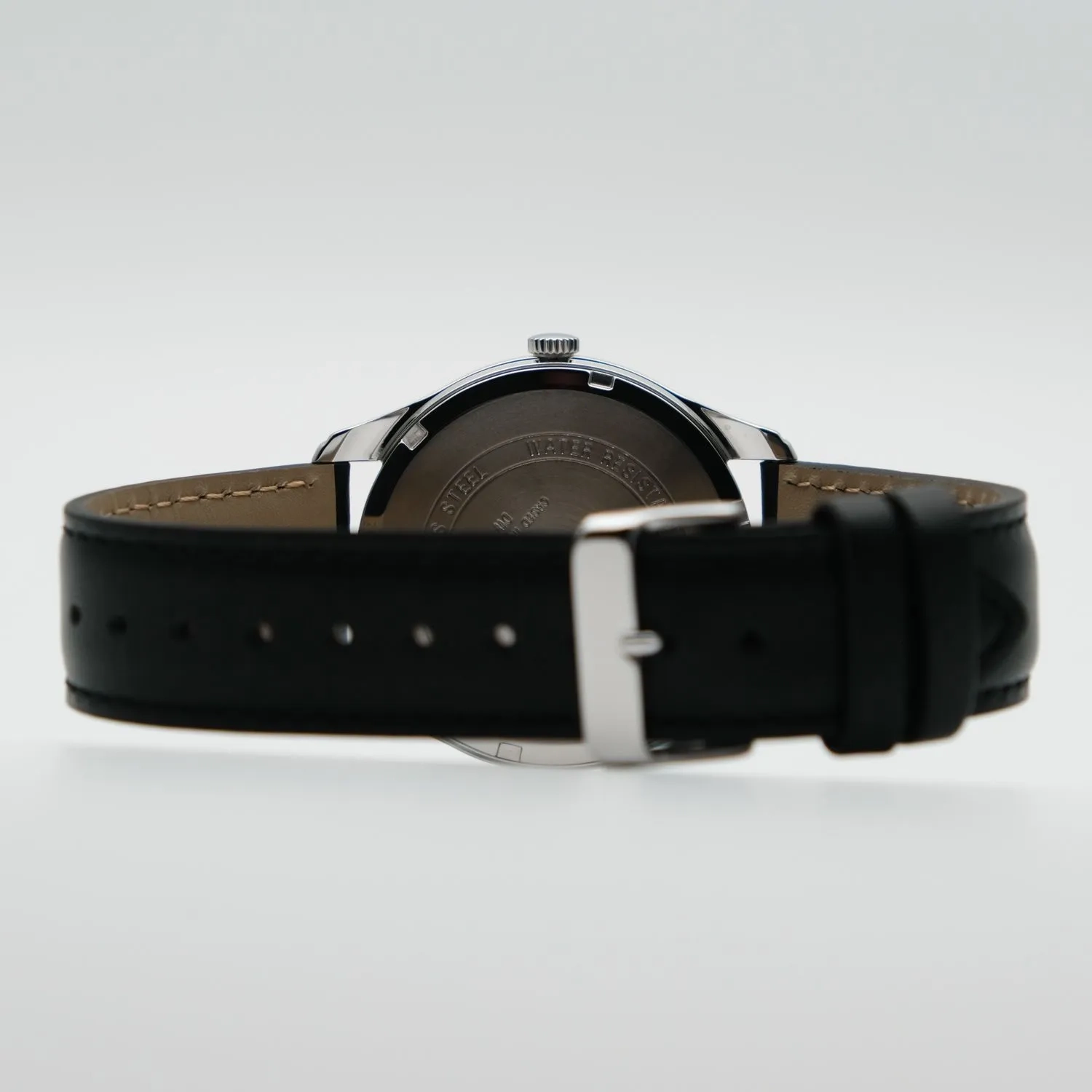 . Точный кварцевый механизм с аналоговой индикацией. В отличие от механических часов, не требуют завода и работают от батареи, показывая отклонение всего несколько секунд в месяц. Ремешок изготовлен из кожи. Гибкость такого ремешка позволяет точно регулировать посадку часов на руке. Отображение времени возможно в 12-часовом или 24-часовом формате. Аккумулятор обеспечивает часы достаточным питанием приблизительно на 3 года. Корпус изготовлен из высококачественной нержавеющей стали 316L с высокими антикоррозийными свойствами. Прочное, устойчивое к царапинам минеральное стекло защищает часы от повреждений. Часы являются водонепроницаемыми до 5 Бар. Цвет корпуса: Серебристый. Цвет циферблата: Зеленый. Высота (с ушками): 46.5 мм. Толщина: 9.7 мм. Гарантия: 2 года.