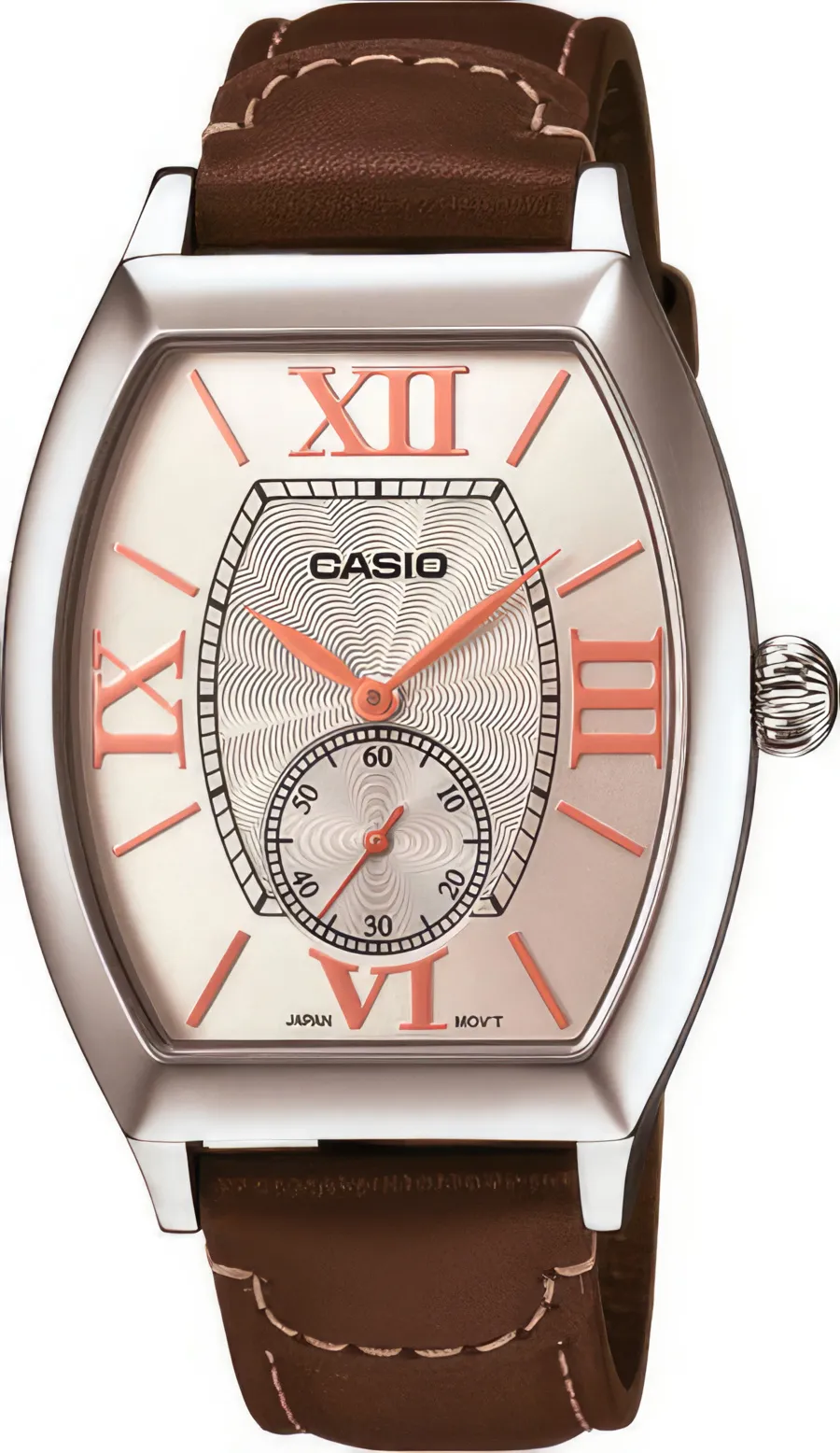 Есть парные женские модели – LTP-E114L-4A2 / LTP-E114L-6A / LTP-E114L-7A / LTP-E114D-1A / LTP-E114D-7A / LTP-E114L-4A1 / LTP-E114L-2A. Оформление часов выдержано в ретро стиле. Корпус имеет бочкообразную форму характерную для традиционного стиля. Технические характеристики:
