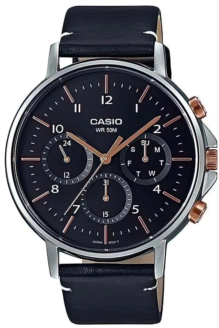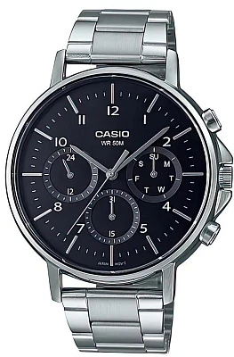 Мужские наручные часы Casio Collection MTP-E321L-1A. Точный кварцевый механизм с аналоговой индикацией. Корпус изготовлен из высококачественной нержавеющей стали 316L с высокими антикоррозийными свойствами. На циферблате отображается текущее число месяца и день недели. Ремешок изготовлен из кожи. Прочное, устойчивое к царапинам минеральное стекло защищает часы от повреждений. Часы являются водонепроницаемыми до 5 Бар. Цвет циферблата: Черный. Ширина (с заводной головкой): 50мм. Толщина: 10мм. Гарантия: 2 года.