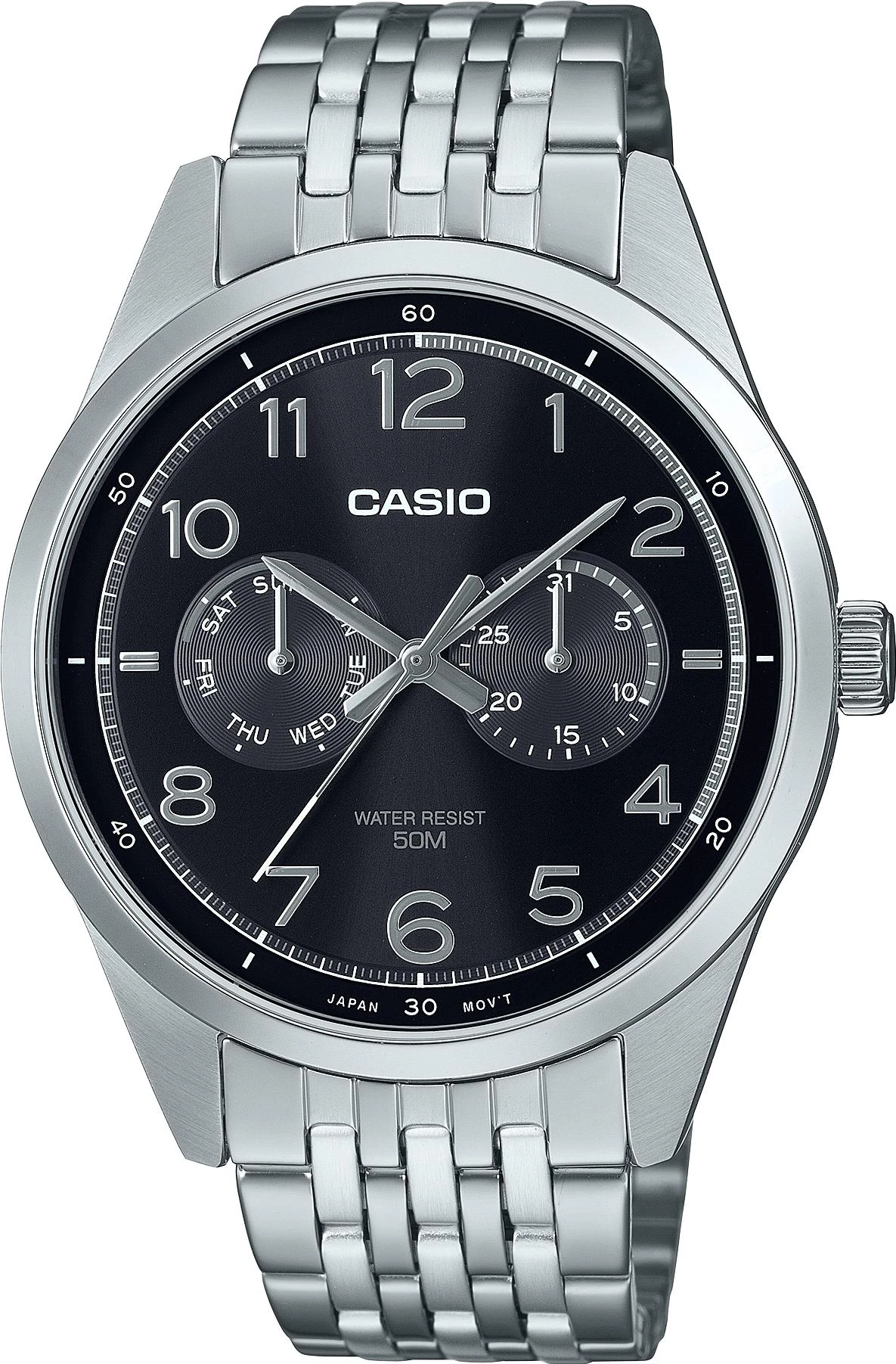 Мужские наручные часы Casio Collection MTP-E340D-1A. Точный кварцевый механизм с аналоговой индикацией. Браслет из нержавеющей стали. Браслет из нержавеющей стали. Прочное, устойчивое к царапинам минеральное стекло защищает часы от повреждений. На циферблате отображается текущее число месяца и день недели. Часы являются водонепроницаемыми до 5 Бар. Цвет циферблата: Серебристый. Цвет корпуса: Черный. На стрелки и отметки нанесен светонакопительный состав, благодаря этому считывать информацию с циферблата возможно и в темноте. Высота (с ушками): 51 мм. Толщина: 9 мм. Гарантия: 2 года.
