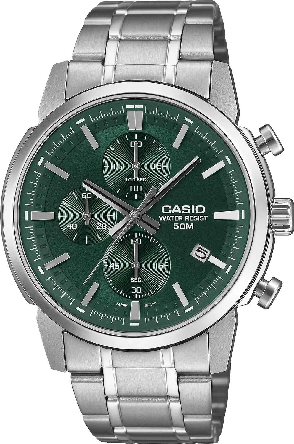 Часы-хронограф с секундомером, обеспечивающим точность показаний до 1/10 секунды и время измерения до 1 часа, оснащены циферблатом с метками в виде штрихов, выполненным по технологии Sunray для создания эффекта солнечных лучей, и окошком даты в положении 4 часа. Задняя крышка с винтовым фиксатором обеспечивает надежную защиту, а батарейки хватает на 3 года работы. Часы дополнены браслетом с удобной тройной раскладывающейся застежкой, которая расстегивается одним касанием.