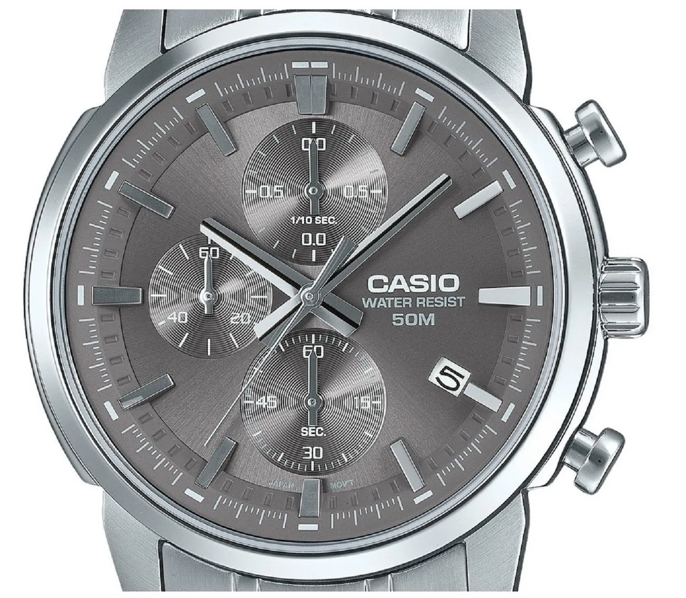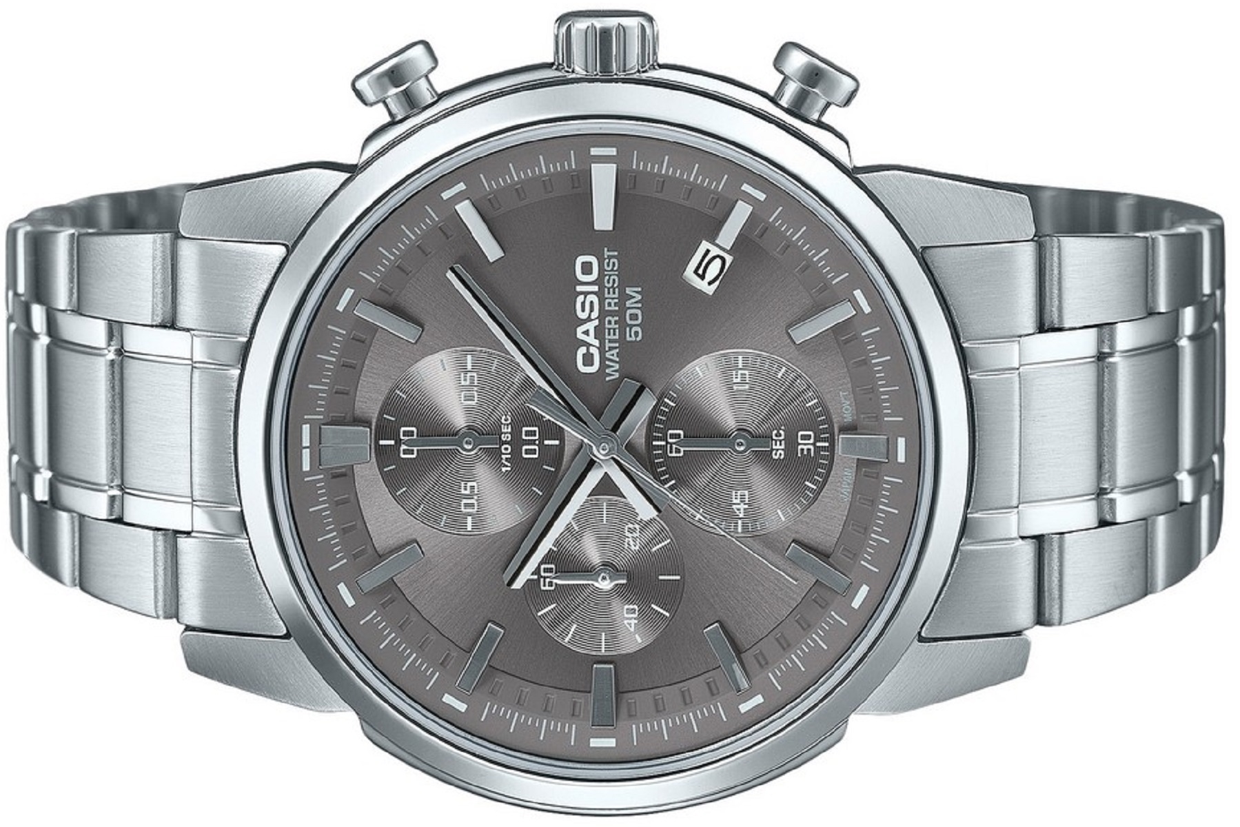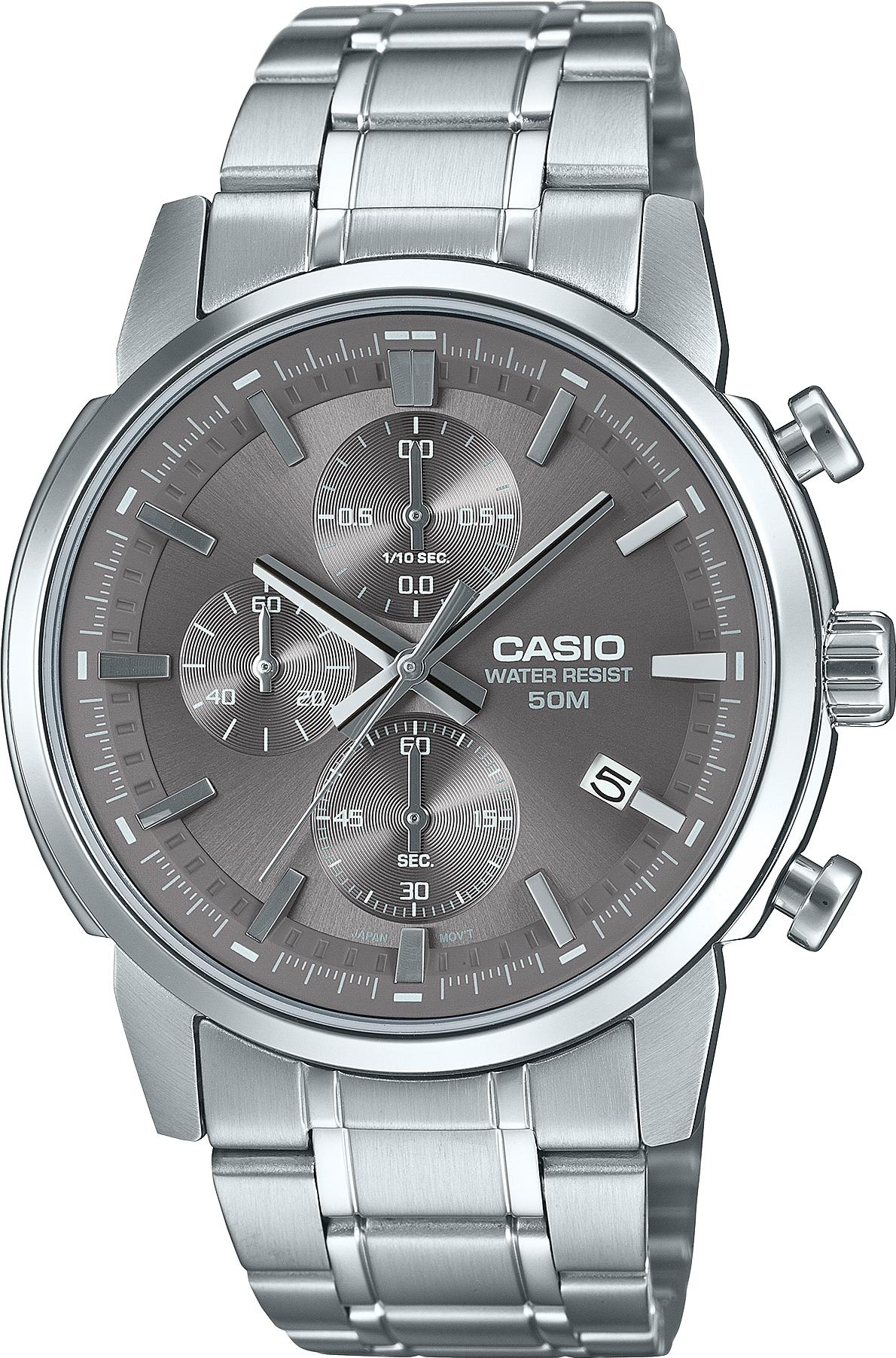 Мужские наручные часы Casio Collection MTP-E510D-8A. Точный кварцевый механизм с аналоговой индикацией. Браслет из нержавеющей стали. Функция хронографа. Браслет из нержавеющей стали. Прочное, устойчивое к царапинам минеральное стекло защищает часы от повреждений. На циферблате отображается текущее число месяца. Часы являются водонепроницаемыми до 5 Бар. Цвет циферблата: Серебристый. Цвет корпуса: Серый. Высота (с ушками): 46 мм. Толщина: 11 мм. Гарантия: 2 года.
