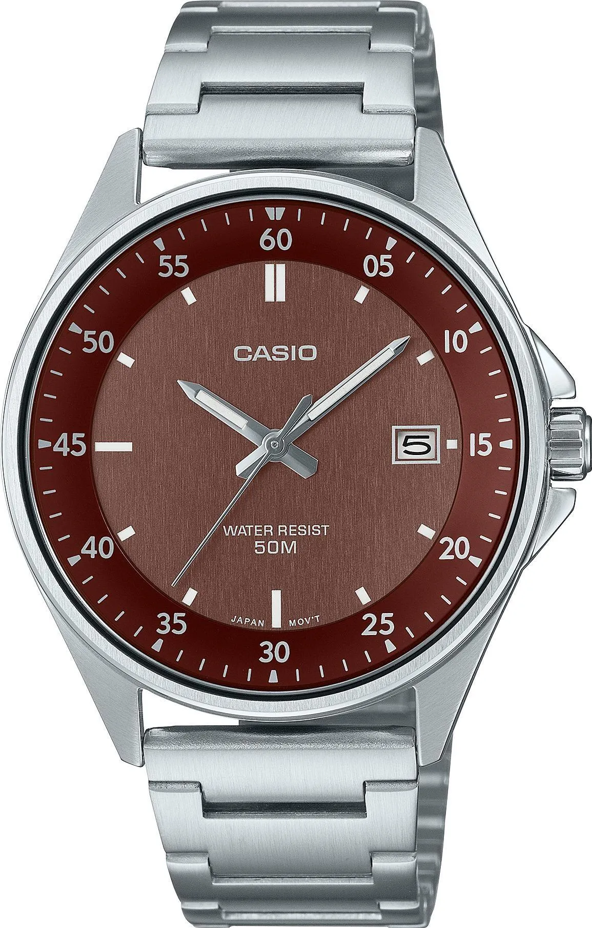 Мужские наручные часы Casio Collection MTP-E705D-5E. Точный кварцевый механизм с аналоговой индикацией. Браслет из нержавеющей стали. Аккумулятор обеспечивает часы достаточным питанием приблизительно на 3 года. Браслет из нержавеющей стали. Прочное, устойчивое к царапинам минеральное стекло защищает часы от повреждений. На циферблате отображается текущее число месяца. Часы являются водонепроницаемыми до 5 Бар. Цвет циферблата: Серебристый. Цвет корпуса: Коричневый. На стрелки и отметки нанесен светонакопительный состав, благодаря этому считывать информацию с циферблата возможно и в темноте. Толщина: 8 мм. Гарантия: 2 года.