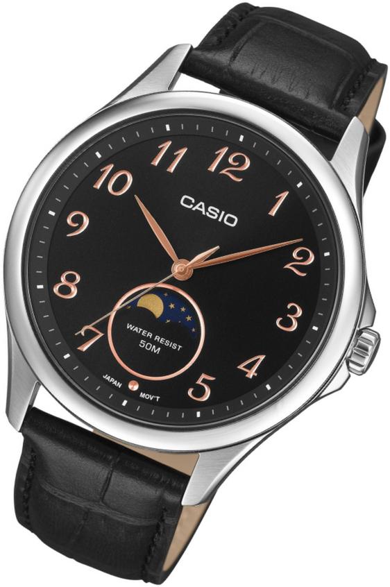 Стильные мужские кварцевые часы с классическим циферблатом, отображающим время с помощью центральных часовой, минутной и секундной стрелок. Дополнительная функция – индикация фаз Луны. Время легко читается благодаря арабским цифрам. Корпус из прочной нержавеющей стали имеет круглую форму и дополнен надежным кожаным браслетом. Защиту циферблата обеспечивает минеральное стекло, устойчивое к царапинам. Часы обладают водостойкостью WR 50, что позволяет мыть руки и не бояться дождя.