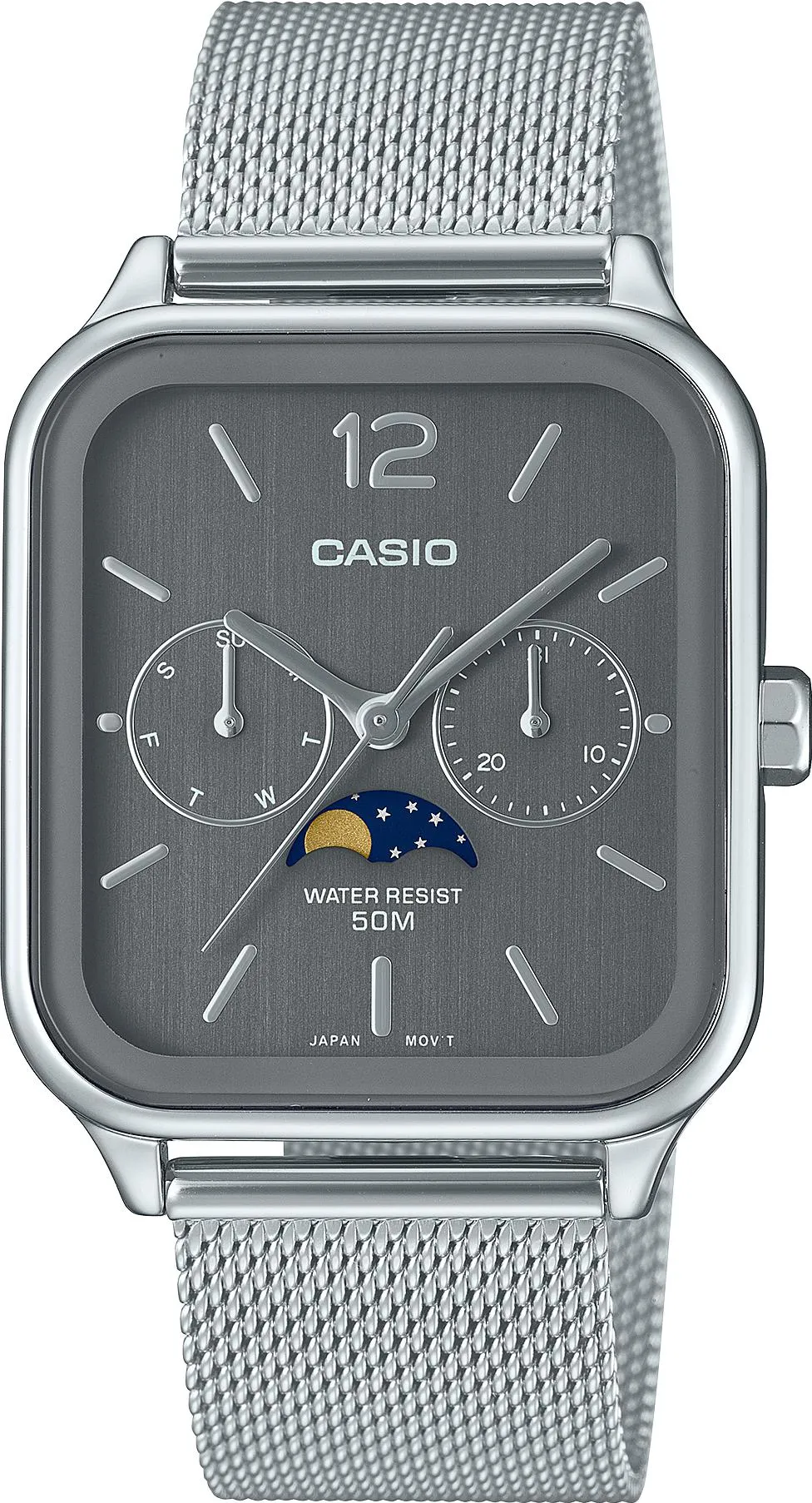 Мужские наручные часы Casio Collection MTP-M305M-8A. Точный кварцевый механизм с аналоговой индикацией. Браслет из нержавеющей стали. Отображение фаз Луны. Часы определяют возраст Луны в текущий момент для текущего местоположения. Аккумулятор обеспечивает часы достаточным питанием приблизительно на 3 года. Браслет из нержавеющей стали. Прочное, устойчивое к царапинам минеральное стекло защищает часы от повреждений. На циферблате отображается текущее число месяца и день недели. Часы являются водонепроницаемыми до 5 Бар. Цвет циферблата: Серебристый. Цвет корпуса: Серый. Толщина: 9.3 мм. Гарантия: 2 года.