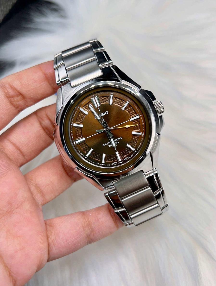 Мужские наручные часы Casio Collection MTP-RS100D-5A. Точный кварцевый механизм с аналоговой индикацией. Браслет из нержавеющей стали. Солнечная батарейка. Солнечная подзаряжающаяся батарейка обеспечивает питание часов для работы. Браслет из нержавеющей стали. Прочное, устойчивое к царапинам минеральное стекло защищает часы от повреждений. Часы являются водонепроницаемыми до 5 Бар. Цвет циферблата: Серебристый. Цвет корпуса: Коричневый. На стрелки и отметки нанесен светонакопительный состав, благодаря этому считывать информацию с циферблата возможно и в темноте. Толщина: 10 мм. Гарантия: 2 года.