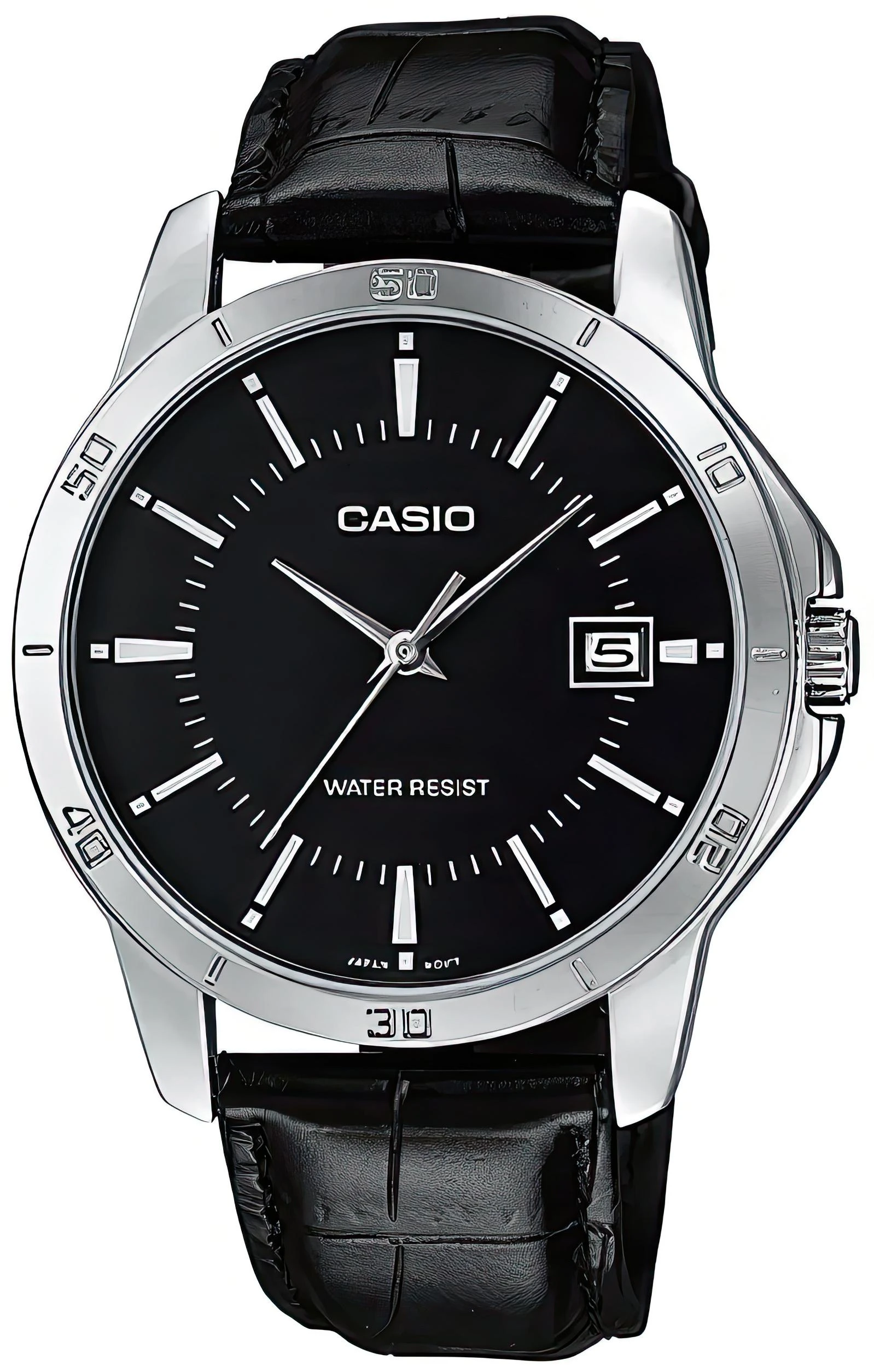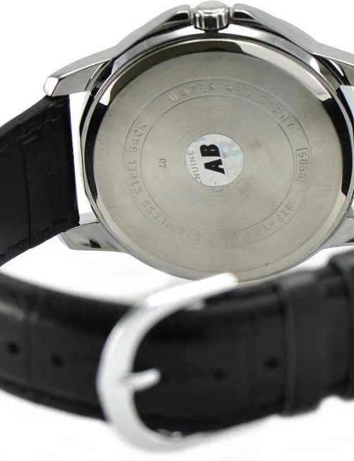 Мужские наручные часы с окошком даты и центральной секундной стрелкой в стальном круглом корпусе, вместо цифр риски на черном циферблате. На черном кожаном ремешке.