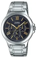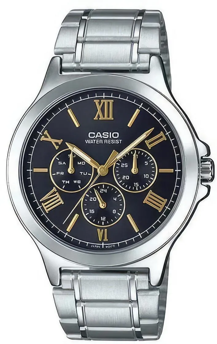 Мужские наручные часы Casio Collection MTP-V300D-1A2. Точный кварцевый механизм с аналоговой индикацией. Корпус изготовлен из высококачественной нержавеющей стали 316L с высокими антикоррозийными свойствами. На стрелки и отметки нанесен светонакопительный состав, благодаря этому считывать информацию с циферблата возможно и в темноте. На циферблате отображается текущее число месяца и день недели. Браслет из нержавеющей стали. Прочное, устойчивое к царапинам минеральное стекло защищает часы от повреждений. Часы являются водонепроницаемыми до 3 Бар. Цвет корпуса: Серебристый. Цвет циферблата: Черный. Ширина (с заводной головкой): 47мм. Толщина: 9мм. Гарантия: 2 года.
