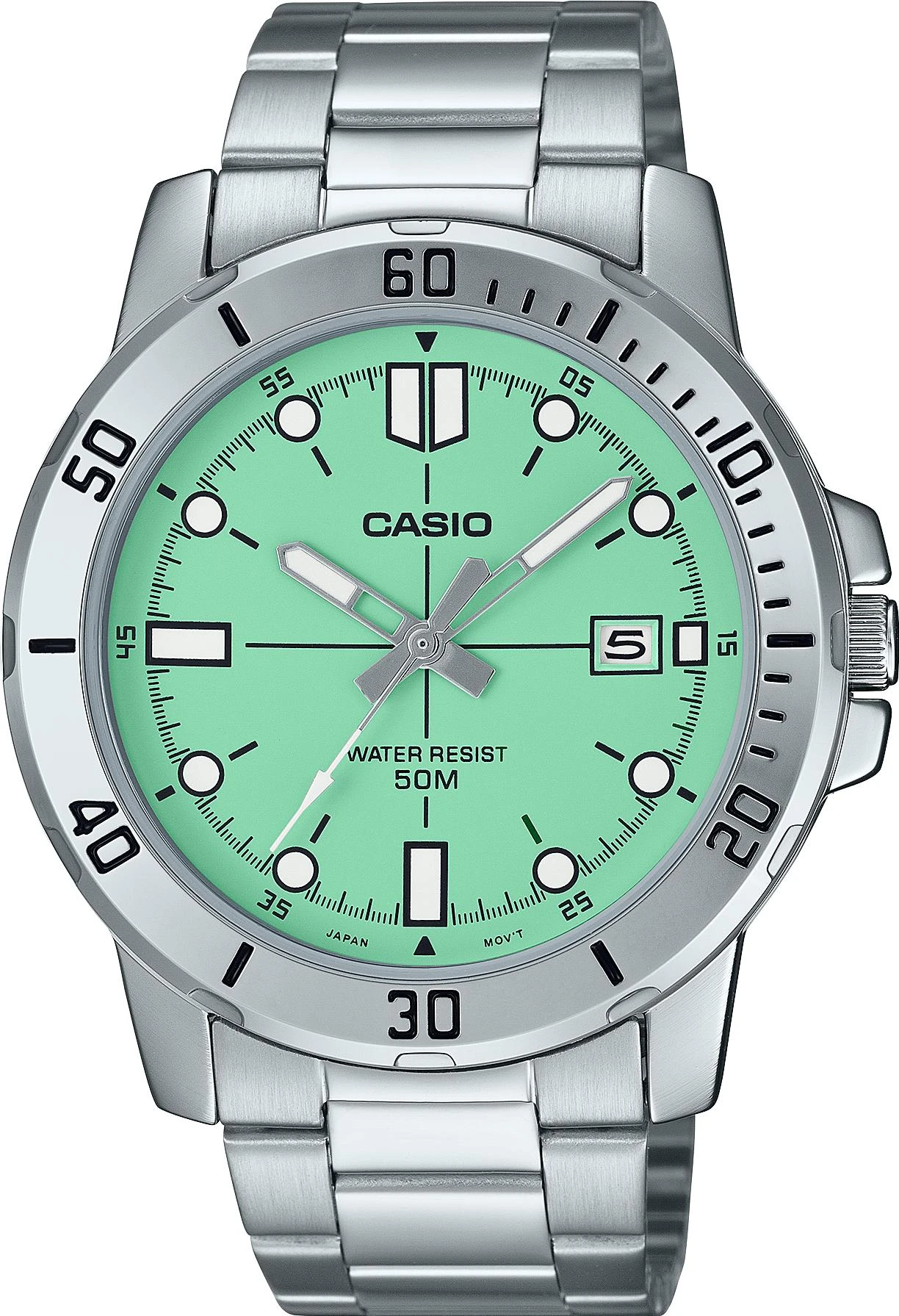 Мужские наручные часы Casio Collection MTP-VD01D-3E1. Точный кварцевый механизм с аналоговой индикацией. Браслет из нержавеющей стали. Латунный браслет. Прочное, устойчивое к царапинам минеральное стекло защищает часы от повреждений. На циферблате отображается текущее число месяца. Часы являются водонепроницаемыми до 5 Бар. Цвет циферблата: Серебристый. Цвет корпуса: Зеленый. На стрелки и отметки нанесен светонакопительный состав, благодаря этому считывать информацию с циферблата возможно и в темноте. Высота (с ушками): 49 мм. Толщина: 10 мм. Гарантия: 2 года.
