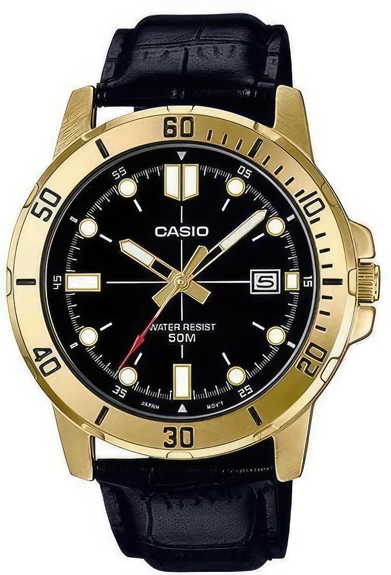 Мужские часы в универсальном стиле. Доступная цена. Круглый металлический корпус с IP-покрытием цвета золота, кожаный ремешок. Безель с гравированной разметкой. Минеральное стекло. Водозащита 5 АТМ. Японский кварцевый механизм.