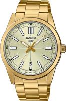 Мужские наручные часы Casio Collection MTP-VD02G-9E. Точный кварцевый механизм с аналоговой индикацией. Корпус изготовлен из высококачественной нержавеющей стали 316L с высокими антикоррозийными свойствами. На стрелки и отметки нанесен светонакопительный состав, благодаря этому считывать информацию с циферблата возможно и в темноте. На циферблате отображается текущее число месяца. Аккумулятор обеспечивает часы достаточным питанием приблизительно на 3 года. Браслет из нержавеющей стали. Прочное, устойчивое к царапинам минеральное стекло защищает часы от повреждений. Часы являются водонепроницаемыми до 3 Бар. Цвет корпуса: Желтое золото. Цвет циферблата: Золотистый. Ширина (с заводной головкой): 48мм. Толщина: 10мм. Гарантия: 2 года.
