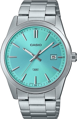 Мужские наручные часы Casio Collection MTP-VD03D-2A3. Точный кварцевый механизм с аналоговой индикацией. Корпус изготовлен из высококачественной нержавеющей стали 316L с высокими антикоррозийными свойствами. На стрелки и отметки нанесен светонакопительный состав, благодаря этому считывать информацию с циферблата возможно и в темноте. На циферблате отображается текущее число месяца. Батарейка на 3 года. Браслет из нержавеющей стали. Прочное, устойчивое к царапинам минеральное стекло защищает часы от повреждений. Часы являются водонепроницаемыми до 3 Бар. Цвет корпуса: Серебристый. Цвет циферблата: Голубой. Ширина (с заводной головкой): 41мм. Толщина: 10мм. Гарантия: 2 года.