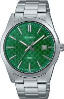 Мужские наручные часы Casio Collection MTP-VD03D-3A1. Точный кварцевый механизм с аналоговой индикацией. В отличие от механических часов, не требуют завода и работают от батареи, показывая отклонение всего несколько секунд в месяц. На стрелки и отметки нанесен светонакопительный состав, благодаря этому считывать информацию с циферблата возможно и в темноте. Браслет из нержавеющей стали обладает высокой прочностью и износостойкостью, обеспечивая долговечность даже при активной эксплуатации. Материал устойчив к коррозии и сохраняет свой внешний вид надолго. Корпус изготовлен из высококачественной часовой латуни с высокими антикоррозийными свойствами. Прочное, устойчивое к царапинам минеральное стекло защищает часы от повреждений. Часы являются водонепроницаемыми до 3 Бар. Цвет циферблата: Зеленый. Высота (с ушками): 48 мм. Толщина: 9.6 мм. Гарантия: 2 года. Другие наименования модели: MTP-VD03D-3A1UDF.