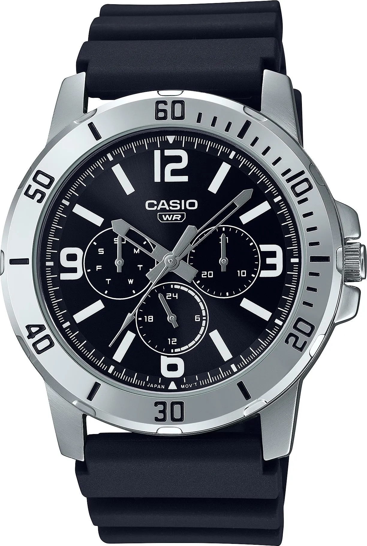 Мужские наручные часы Casio Collection MTP-VD300-1B. Точный кварцевый механизм с аналоговой индикацией. Полимерный ремешок. Натуральный полимерный материал является идеальным для изготовления ремешка благодаря своей чрезвычайной прочности и гибкости. Аккумулятор обеспечивает часы достаточным питанием приблизительно на 3 года. Браслет из нержавеющей стали. Прочное, устойчивое к царапинам минеральное стекло защищает часы от повреждений. На циферблате отображается текущее число месяца и день недели. Часы являются водонепроницаемыми до 3 Бар. Цвет циферблата: Серебристый. Цвет корпуса: Черный. Толщина: 9 мм. Гарантия: 2 года.