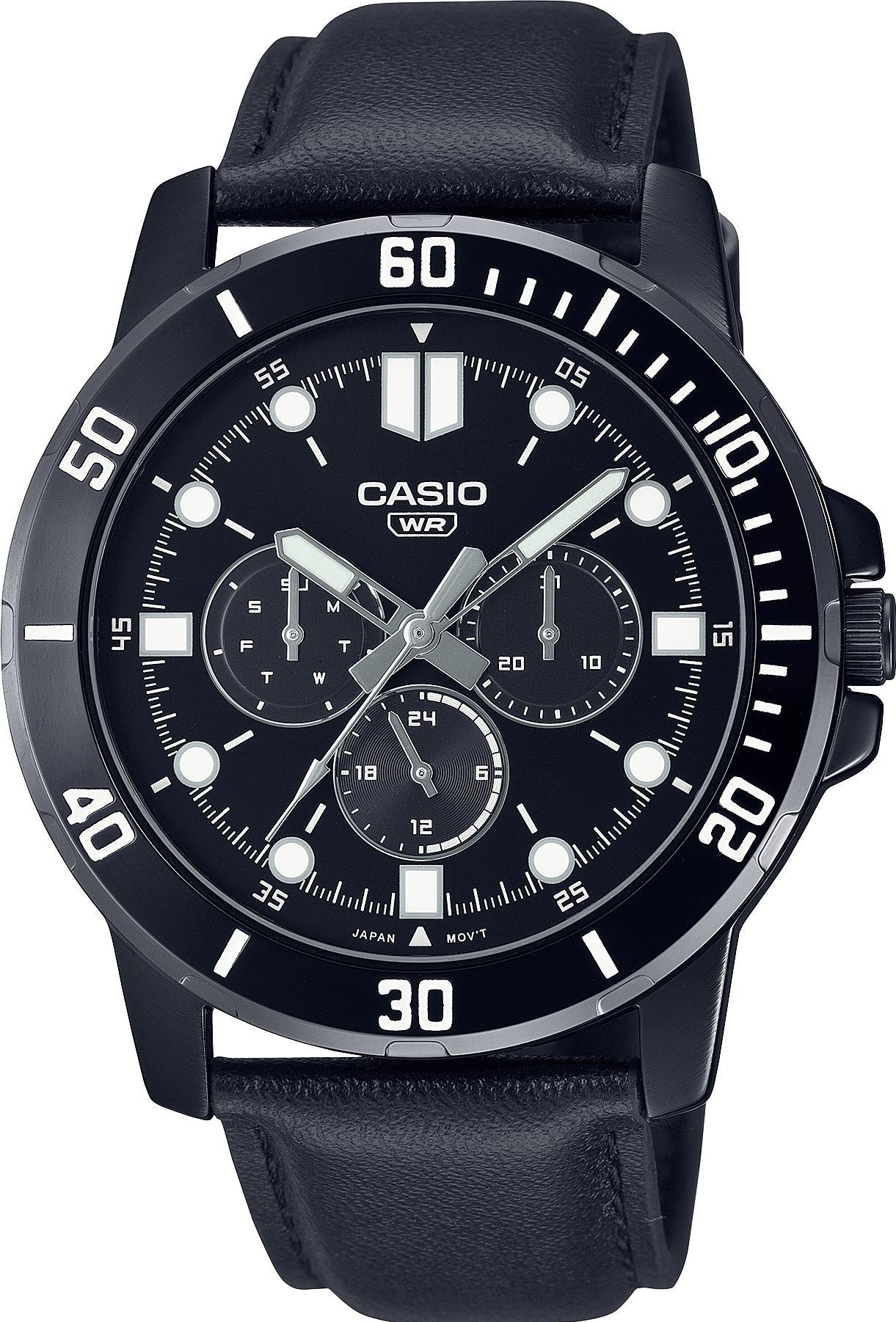 Мужские наручные часы Casio Collection MTP-VD300BL-1E. Точный кварцевый механизм с аналоговой индикацией. Корпус изготовлен из высококачественной нержавеющей стали 316L с высокими антикоррозийными свойствами. На стрелки и отметки нанесен светонакопительный состав, благодаря этому считывать информацию с циферблата возможно и в темноте. На циферблате отображается текущее число месяца и день недели. Аккумулятор обеспечивает часы достаточным питанием приблизительно на 3 года. Отображение времени возможно в 12-часовом или 24-часовом формате. Ремешок изготовлен из кожи. Прочное, устойчивое к царапинам минеральное стекло защищает часы от повреждений. Часы являются водонепроницаемыми до 3 Бар. Цвет корпуса: Черный. Цвет циферблата: Черный. Ширина (с заводной головкой): 45мм. Толщина: 9мм. Гарантия: 2 года.