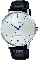 Мужские наручные часы. Японский кварцевый механизм. Серебристый циферблат. Минеральное стекло. Круглый стальной корпус с полированной поверхностью. Черный кожаный ремешок с тиснением. Индикация индексами и римскими цифрами синего цвета.
