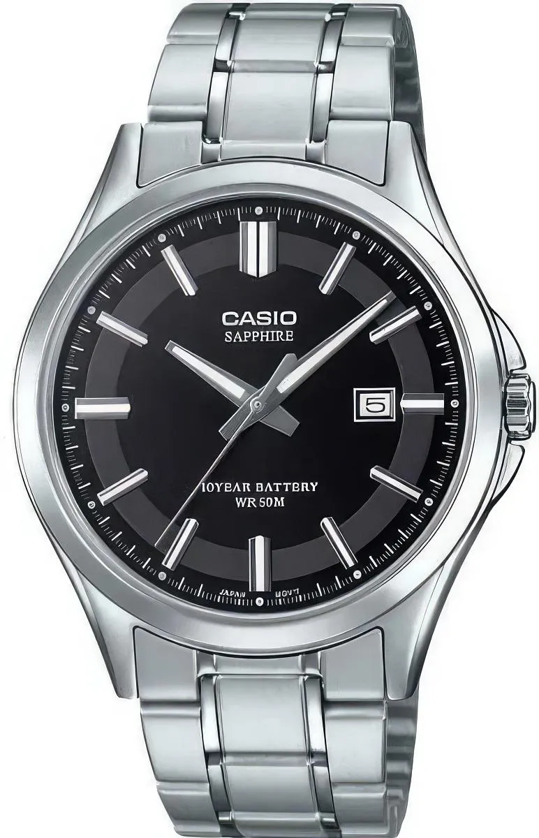 Мужские наручные часы. Японский кварцевый механизм. Центральная секундная стрелка. Окошко даты. Циферблат черного цвета. Сапфировое стекло. Круглый корпус из нержавеющего стального сплава. Металлический браслет стального цвета.