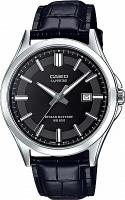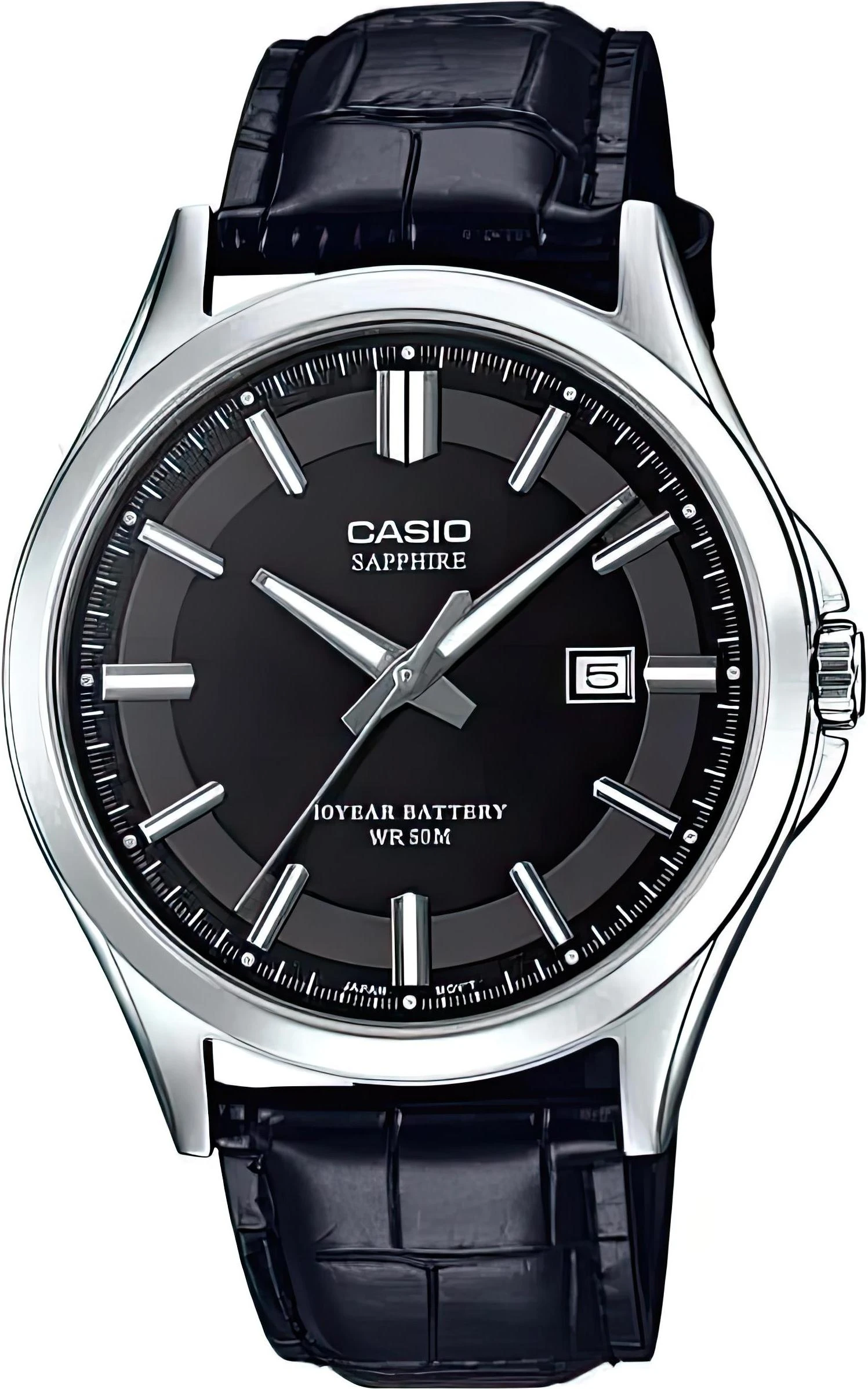 Мужские наручные часы. Точный кварцевый механизм. Центральная секундная стрелка. Окошко даты. Черный циферблат. Сапфировое стекло. Круглый металлический корпус с полированной поверхностью. Кожаный ремешок черного цвета.