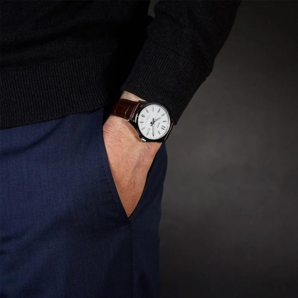 Мужские наручные часы. Точный кварцевый механизм. Окошко даты в позиции 3-х часов. Белый циферблат. Сапфировое стекло. Круглый полированный корпус из стали. Ремешок с тиснением из натуральной кожи коричневого цвета.