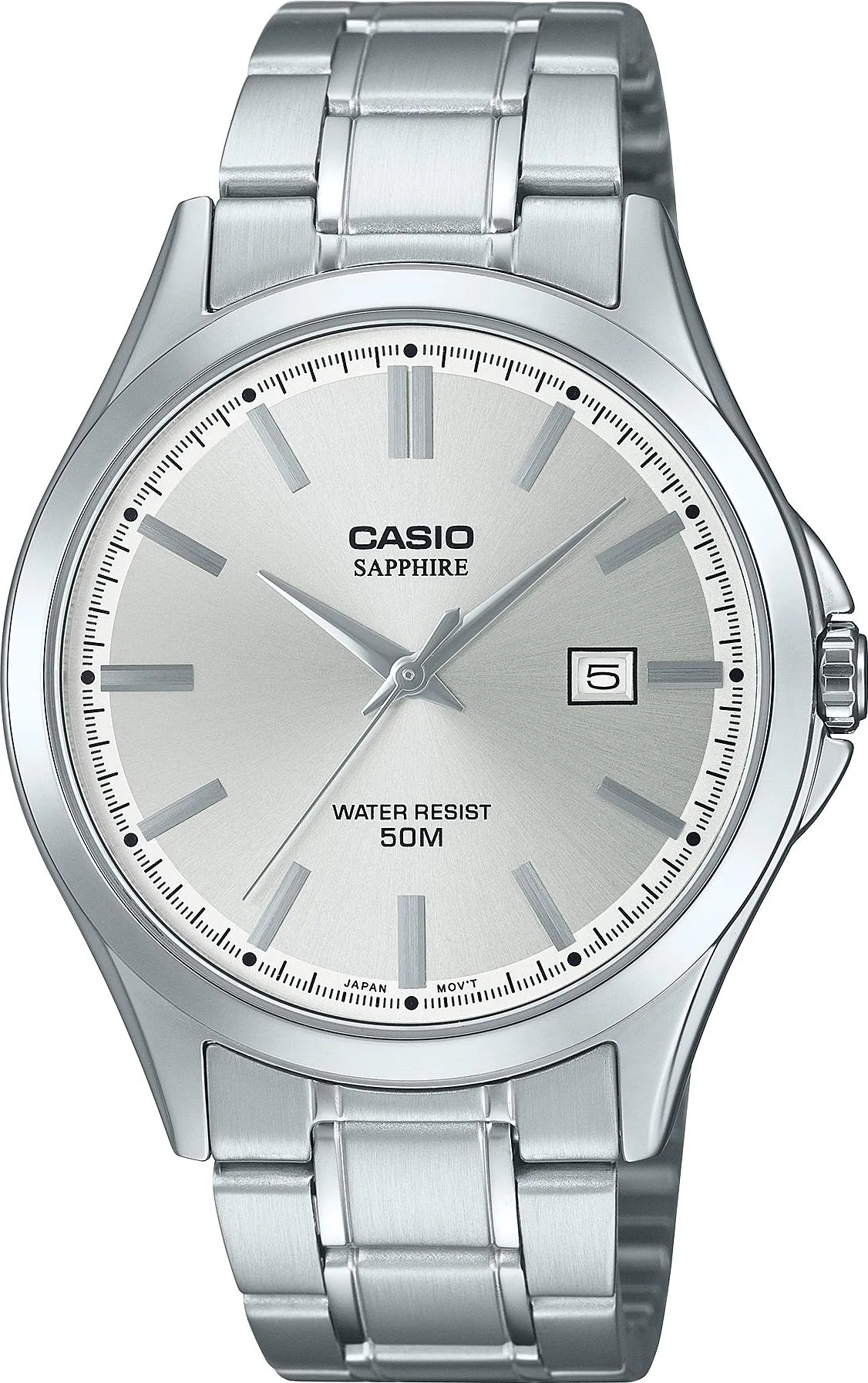 Сапфировое стекло. Корпус и браслет из нержавеющей стали. Отображение даты. Водонепроницаемость 50 метров