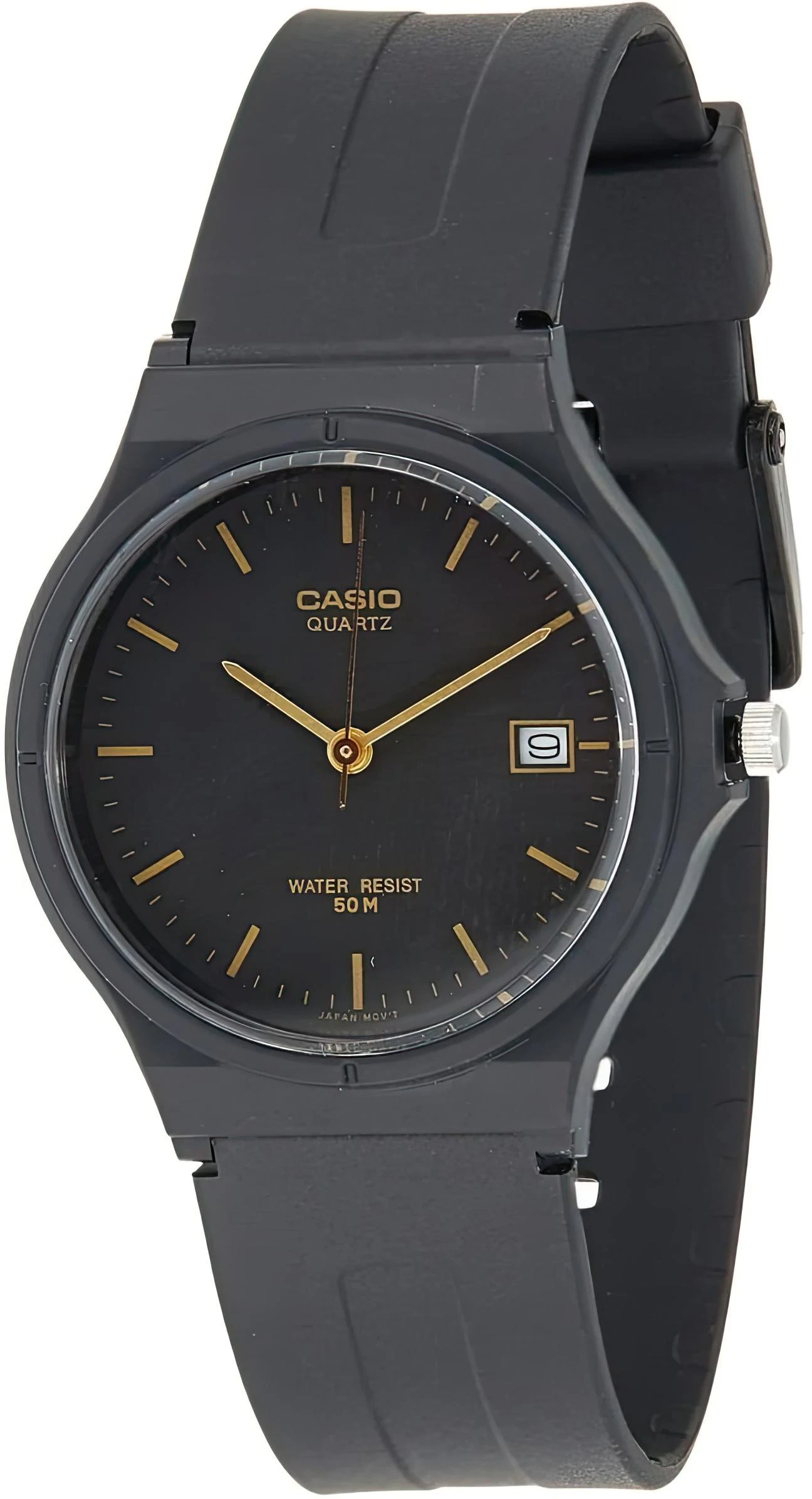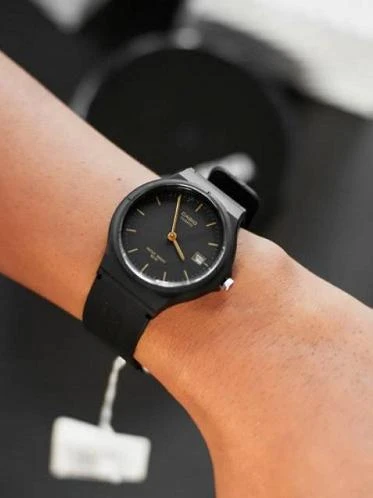 Наручные часы на резиновом браслете, черного цвета , с окошком даты и центральной секундной стрелкой.
