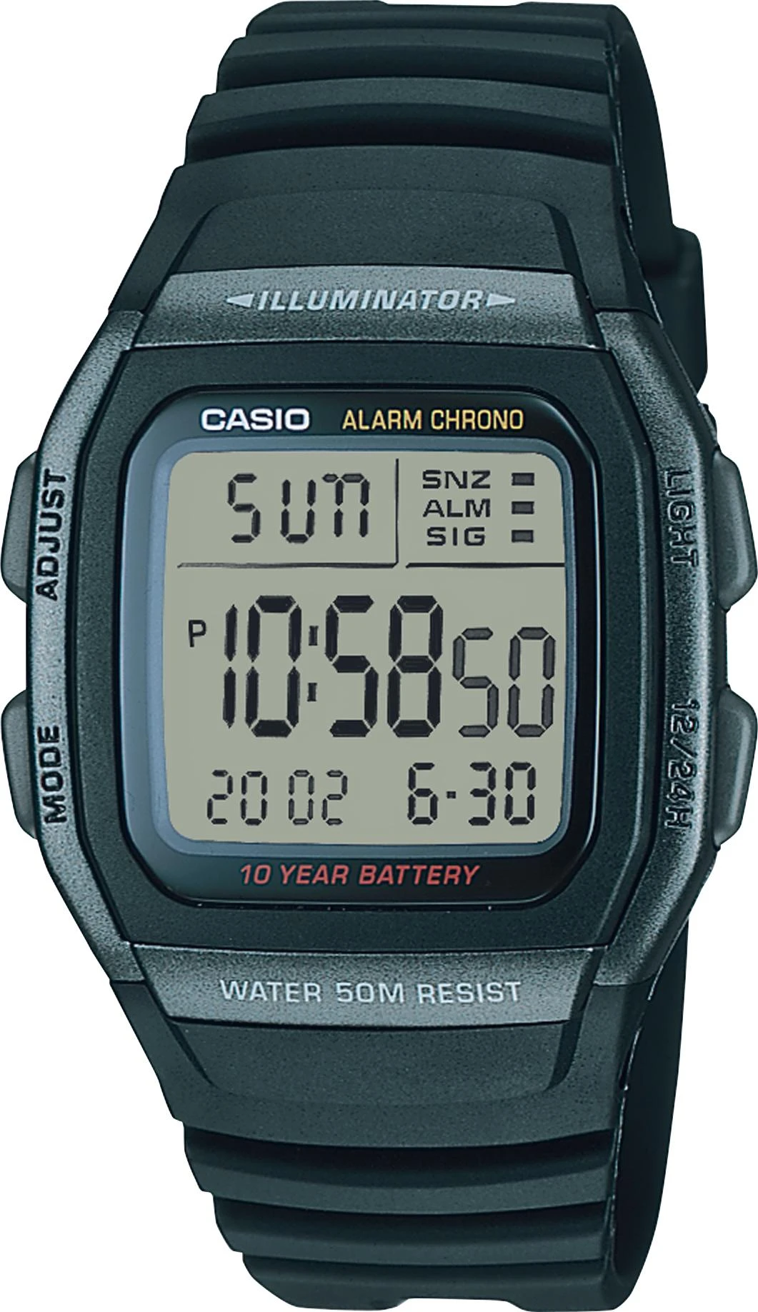 Наручные часы в пластиковом корпусе с возможностью указания времени в двух различных часовых поясах. Подсветка при помощи светодиода. Секундомер, рассчитаный на 24 часа с точностью 1/100 сек. Будильник с функцией SNOOZE. Возможность установки 1 ежедневного сигнала и выбора 12/24-часового формата времени. Полностью автоматический календарь. Водозащита 50 метров. Срок работы батарейки до 10 лет.