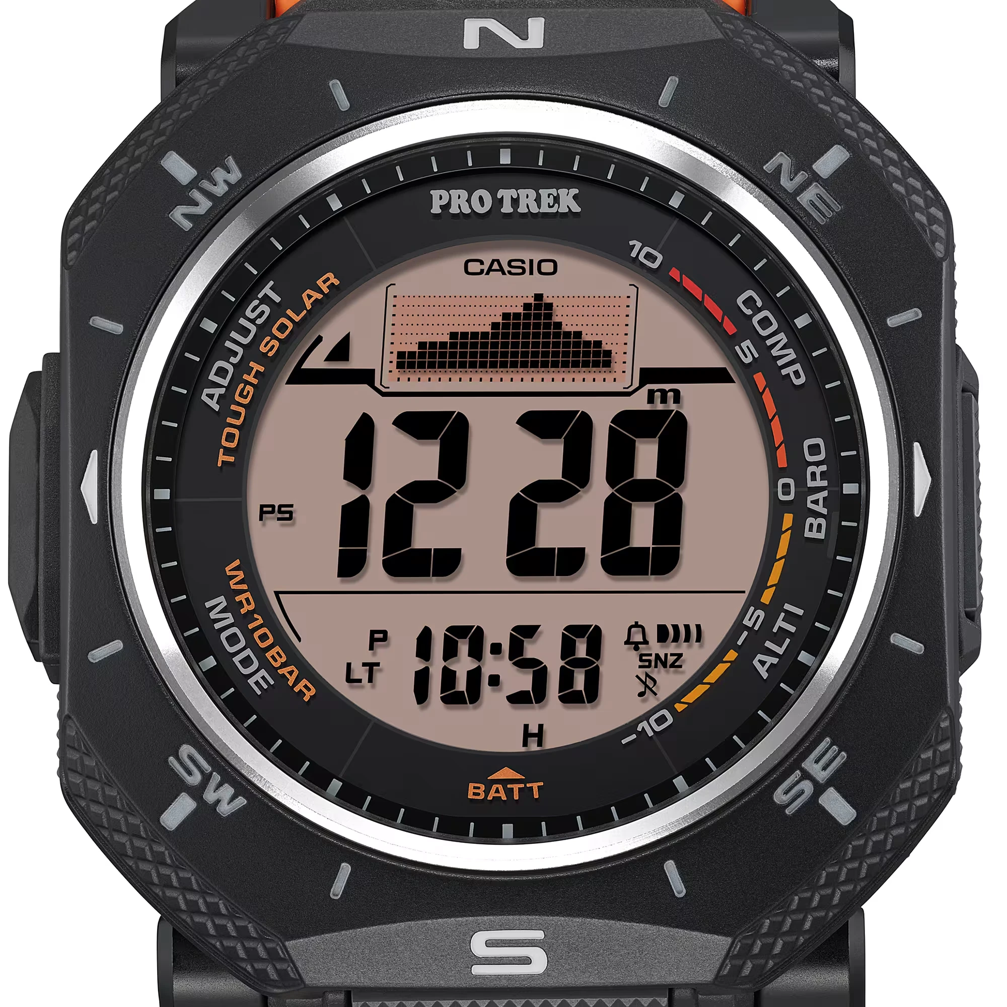 Главное преимущество модели — система Tough Solar, которая заряжает аккумулятор от источника света. Контролировать запас энергии помогает встроенный индикатор уровня заряда. За навигацию отвечает фирменный Triple Sensor: цифровой компас, альтиметр (до 10 000 м) с памятью данных, барометр для прогнозирования погоды и термометр. Для планирования маршрута предусмотрена функция отображения времени восхода и захода солнца, а мировое время в 48 городах делает модель удобной для дальних путешествий. Высокоточный секундомер с шагом 1/10 секунды и пределом измерения до 1000 часов, а также 24-часовой таймер позволяют четко контролировать время. Система из 5 независимых будильников и функция ежечасного сигнала помогут не пропустить важные события. Модель адаптирована к суровым условиям: сохраняет работоспособность при низких температурах до –10°C и обладает водозащитой 10 бар. Это надежный, автономный и функциональный спутник для тех, кто привык полагаться на точные приборы в любой точке мира.