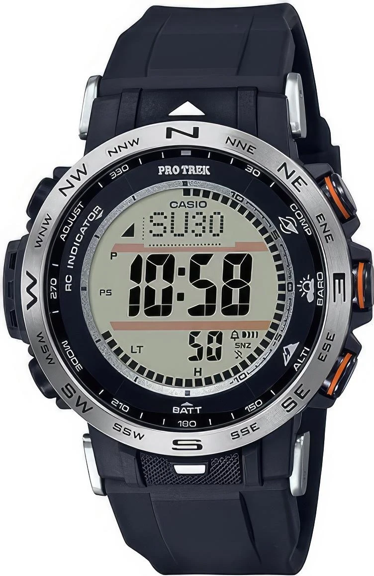 Многофункциональные ударопрочные часы для экстримального туризма. Встроенные альтиметр, барометр, датчик температуры и цифровой компасс. Подзарядка от солнечных аккумуляторов. Коррекция времени по радиосигналам.