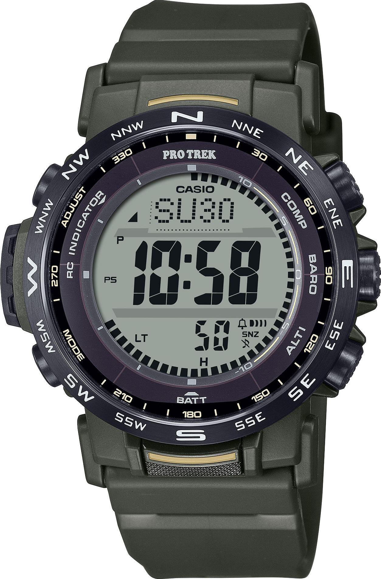 Унисекс наручные часы Casio ProTrek PRW-35Y-3B. Точный кварцевый механизм с цифровой индикацей. Полимерный ремешок. Натуральный полимерный материал является идеальным для изготовления ремешка благодаря своей чрезвычайной прочности и гибкости. После настройки автоматический календарь всегда отображает точную дату. Специальный датчик измеряет давление воздуха и отображает измеренное значение на экране в виде символа. Это дает возможность заранее определить изменения погоды. Функция будильника. Функция хронографа. Индикатор запаса хода. Встроенный цифровой компас определяет северный магнитный полюс. Отображение текущего времени в основных городах и конкретных областях по всему миру. Модель устойчива к низким температурам. Функция перемещения стрелок. Нажатие на кнопку обеспечит перемещение стрелок в такое положение, которое позволит Вам легко считать информацию с маленьких цифровых дисплеев – например, дату или показатели секундомера. Солнечная батарейка. Солнечная подзаряжающаяся батарейка обеспечивает питание часов для работы. Функция таймера. Таймеры обратного отсчета напомнят Вам о текущих или особенных событиях, издав звуковой сигнал в установленное время. Данные о восходе/закате солнца. После введения географического местоположения, на экране будет отображаться восход и закат солнца для любой установленной даты. Отображение времени возможно в 12-часовом или 24-часовом формате. Высотомер (альтиметр). Встроенный датчик давления определяет изменения в атмосферном давлении и преобразовывает полученные результаты в абсолютную высоту. Браслет из нержавеющей стали. Полимерный ремешок. Натуральный полимерный материал является идеальным для изготовления ремешка благодаря своей чрезвычайной прочности и гибкости. Прочное, устойчивое к царапинам минеральное стекло защищает часы от повреждений. На циферблате отображается текущее число, месяц, год и день недели. Часы являются водонепроницаемыми до 10 Бар. Цвет циферблата: Зеленый. Цвет циферблата: Черный. Цвет корпуса: Серый. Светодиодная подсветка. Высота (с ушками): 51 мм. Толщина: 13 мм. Гарантия: 2 года.
