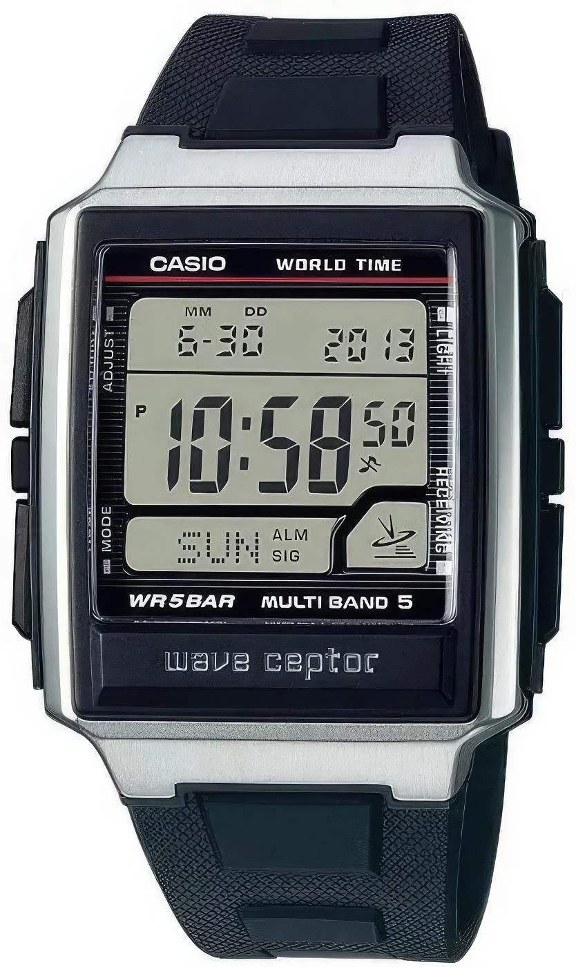 Мужские наручные часы Casio Radio Controlled WV-59R-1A. Точный кварцевый механизм с цифровой индикацией. Полимерный корпус надежно защищает часы от механических повреждений. Светодиодная подсветка. На циферблате отображается текущее число, месяц и день недели. Радио-синхронизация. Часы будут получать радио-сигнал калибровки, гарантирующий, что они всегда будут показывать точное время. Функция хронографа. Функция таймера. Таймеры обратного отсчета напомнят Вам о текущих или особенных событиях, издав звуковой сигнал в установленное время. Ежечасный сигнал. Функция будильника. Аккумулятор обеспечивает часы достаточным питанием приблизительно на 2 года. Отображение текущего времени в основных городах и конкретных областях по всему миру. После настройки автоматический календарь всегда отображает точную дату. Отображение времени возможно в 12-часовом или 24-часовом формате. Полимерный ремешок. Натуральный полимерный материал является идеальным для изготовления ремешка благодаря своей чрезвычайной прочности и гибкости. Органическое стекло. Часы являются водонепроницаемыми до 5 Бар. Цвет корпуса: Черный. Цвет циферблата: Черный. Ширина (с заводной головкой): 48мм. Толщина: 12мм. Гарантия: 2 года.