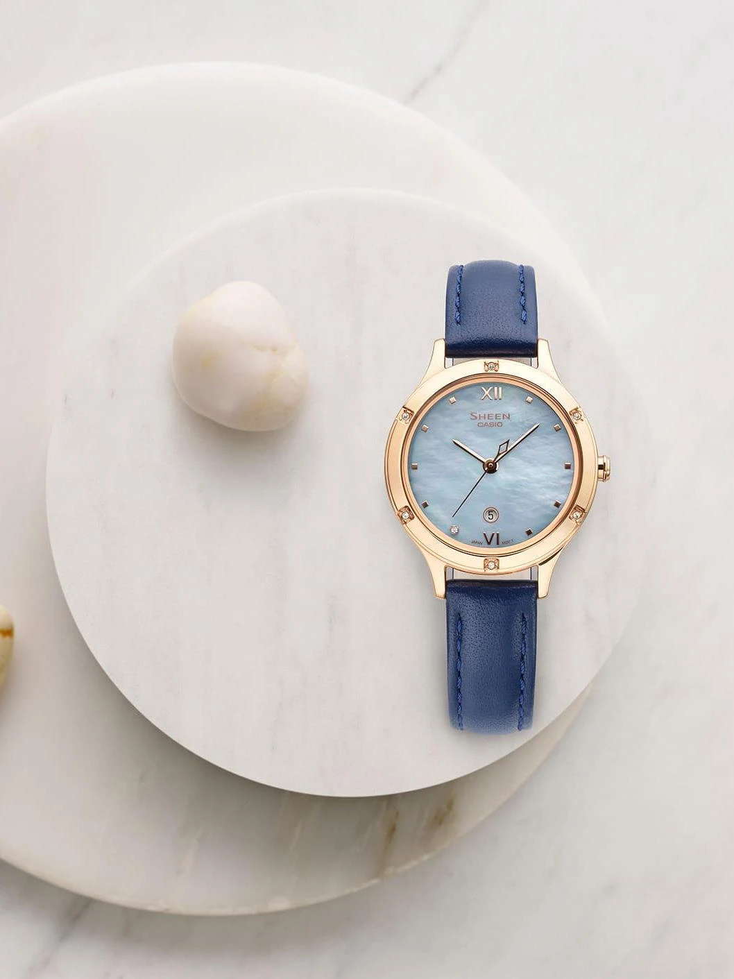 Женские наручные часы Casio Sheen SHE-4546PGL-2A. Точный кварцевый механизм с аналоговой индикацией. Ремешок изготовлен из кожи. Аккумулятор обеспечивает часы достаточным питанием приблизительно на 2 года. Браслет из нержавеющей стали. Сапфировое стекло. Искусственно изготовленное стекло с высокой прочностью и устойчивостью к царапинам. На циферблате отображается текущее число месяца. Часы являются водонепроницаемыми до 5 Бар. Цвет циферблата: Розовое золото. Цвет корпуса: Перламутровый. Толщина: 6 мм. Гарантия: 2 года.