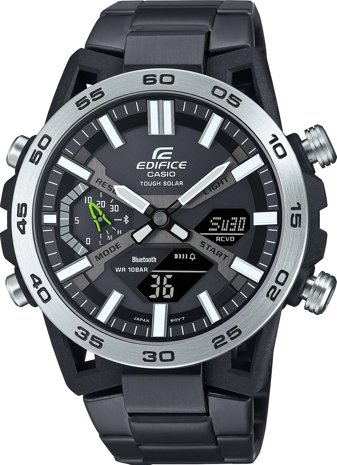 Мужские наручные часы Casio Edifice ECB-2000DD-1A. Точный кварцевый механизм с аналого-цифровой индикацией. Корпус изготовлен из высококачественной нержавеющей стали 316L с высокими антикоррозийными свойствами. Светодиодная подсветка. На циферблате отображается текущее число, месяц и день недели. Автоматический календарь. Авто подсветка. Bluetooth. Будильник. Хронограф. Мировое время. Перемещение стрелок. Солнечная батарея. Таймер. 12/24-часовое отображение времени. Браслет из нержавеющей стали. Прочное, устойчивое к царапинам минеральное стекло защищает часы от повреждений. Часы являются водонепроницаемыми до 10 Бар. Цвет корпуса: Серебристый. Цвет циферблата: Черный. Ширина (с заводной головкой): 48мм. Толщина: 11мм. Гарантия: 2 года. Другие наименования модели: ECB-2000DD-1ADF, ECB-2000DD-1AVD.