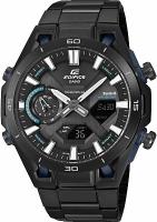 Харизматичный и узнаваемый релиз Casio в коллекции Edifice 2025 года из аналого-цифровой серии ECB-2300 в усиленном карбоном корпусе с черным циферблатом, покрытым минеральным стеклом и стальным безелем. Модель имеет стильный и эргономичный многоуровневый циферблат, который сочетает в себе индикацию времени с помощью контрастных стрелок, два цифровых инверсионных дисплея и стрелочный ретроградный указатель у отметки девяти часов. Особенностью модели является прочный и легкий карбоно-стальной корпус — это одни из немногочисленных часов Edifice в корпусе из карбона. Необычная узнаваемая конструкция корпуса выполнена в стилистике подвесок в формульных гонках, где колеса болида крепятся к шасси на карбоновых лучах. В модели используется мощный модуль, оснащенный Bluetooth, благодаря чему часы могут автоматически подключаться к вашему смартфону через приложение CASIO WATCHES для синхронизации точного времени, удобной настройки или для быстрого поиска телефона. Стоит отметить наличие в модели солнечной батареи, водозащиты в 10 бар, функции мирового времени, секундомера и таймера обратного отсчета, пяти ежедневных будильников и ежечасного сигнала, возможность отображения текущего дня недели на русском языке. Толщина корпуса — 10.9 мм.