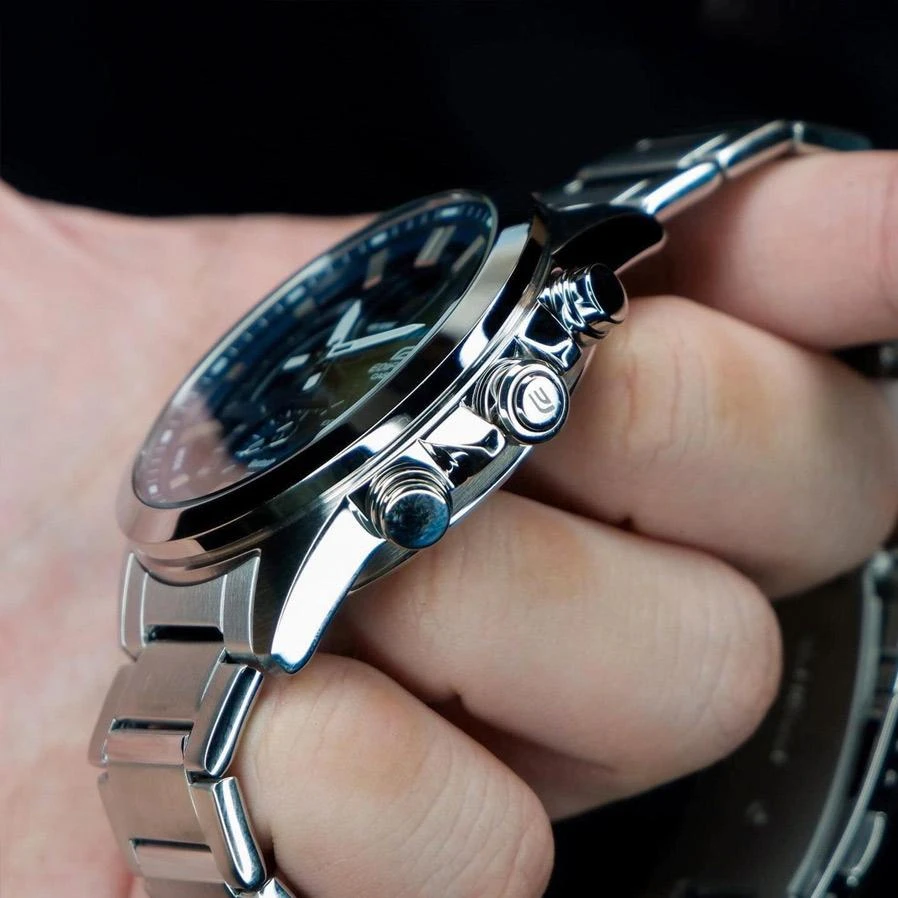 Одним нажатием кнопки вы можете временно сместить стрелки в нейтральное положение. Это открывает полный обзор цифровых дисплеев, позволяя беспрепятственно считать дату, показатели секундомера или другие данные.