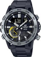 Мужские наручные часы Casio Edifice ECB-40DC-1A. Точный кварцевый механизм с аналого-цифровой индикацией. Корпус изготовлен из высококачественной нержавеющей стали 316L с высокими антикоррозийными свойствами. Светодиодная подсветка. На циферблате отображается текущее число, месяц и день недели. Функция Bluetooth позволяет удобно отображать все метрики с часов на экране смартфона, а также выводить на часы уведомления о входящих звонках, сообщениях и имейлах. Функция хронографа. Функция таймера. Таймеры обратного отсчета напомнят Вам о текущих или особенных событиях, издав звуковой сигнал в установленное время. Для подсветки дисплея используется светодиод, а так же имеет функцию автоматического включения подсветки, если Вы наклоните часы к своему лицу. Функция будильника. Аккумулятор обеспечивает часы достаточным питанием приблизительно на 2 года. Отображение текущего времени в основных городах и конкретных областях по всему миру. После настройки автоматический календарь всегда отображает точную дату. Отображение времени возможно в 12-часовом или 24-часовом формате. Браслет из нержавеющей стали. Прочное, устойчивое к царапинам минеральное стекло защищает часы от повреждений. Часы являются водонепроницаемыми до 10 Бар. Цвет корпуса: Черный. Цвет циферблата: Черный. Ширина (с заводной головкой): 52мм. Толщина: 13мм. Гарантия: 2 года. Другие наименования модели: ECB-40DC-1AEF, ECB-40DC-1ADF.