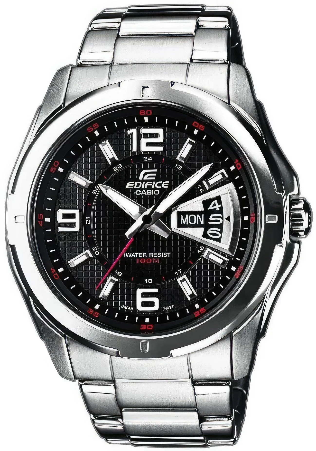 Мужские наручные часы с окошком даты и дня недели в круглом стальном корпусе, на стальном браслете.