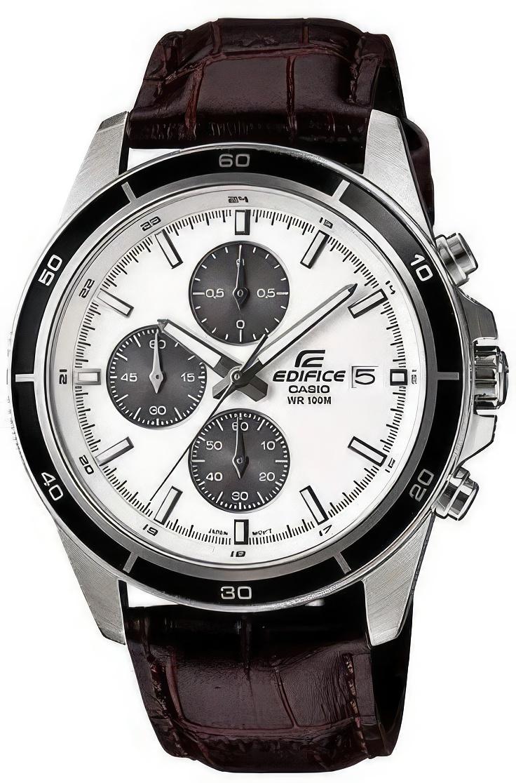 Мужской японский высокоточный хронограф с индикацией даты и высокой степенью водозащиты в стальном корпусе на кожаном ремешке.