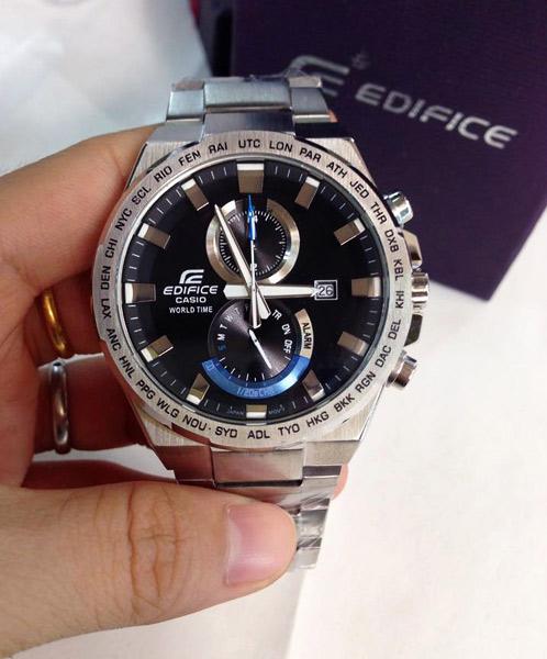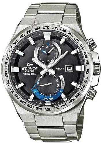 Мужские наручные часы Casio Edifice EFR-542D-1A. Точный кварцевый механизм. Корпус изготовлен из высококачественной нержавеющей стали 316L с высокими антикоррозийными свойствами. На стрелки и отметки нанесен светонакопительный состав, благодаря этому считывать информацию с циферблата возможно и в темноте. На циферблате отображается текущее число месяца и день недели. Функция хронографа. Функция таймера. Таймеры обратного отсчета напомнят Вам о текущих или особенных событиях, издав звуковой сигнал в установленное время. Функция будильника. Аккумулятор обеспечивает часы достаточным питанием приблизительно на 2 года. Отображение текущего времени в основных городах и конкретных областях по всему миру. Браслет из нержавеющей стали. Прочное, устойчивое к царапинам минеральное стекло защищает часы от повреждений. Часы являются водонепроницаемыми до 10 Бар. Ширина (с заводной головкой): 55мм. Толщина: 12мм. Гарантия: 2 года.