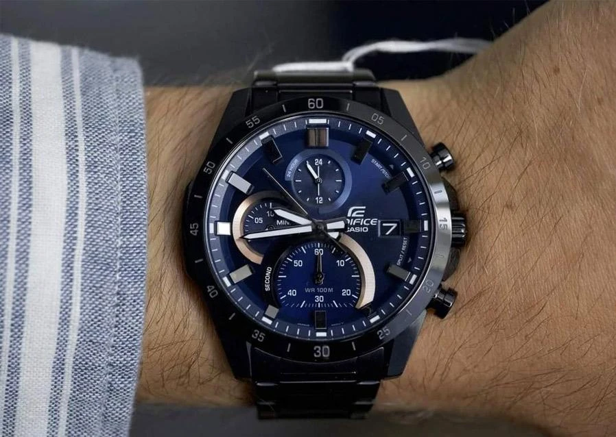 Мужские кварцевые часы с функцией секундомера из серии Edifice. Корпус из нержавеющей стали с покрытием по безелю. Черный циферблат. Минеральное стекло. Браслет из нержавеющей стали. Браслетный замок с предохранительной защелкой. Водозащита 100 м.
