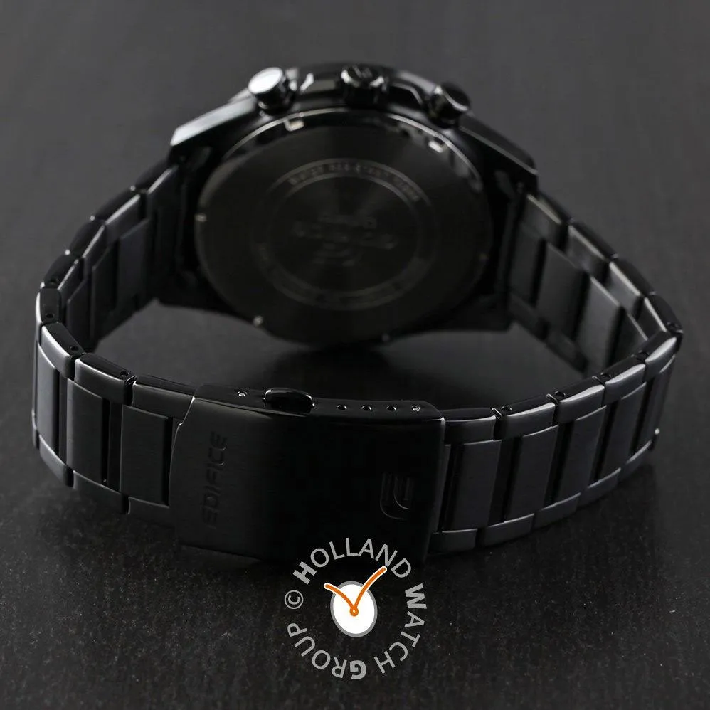 Мужские кварцевые часы с функцией секундомера из серии Edifice. Корпус из нержавеющей стали с покрытием. Черный циферблат. Минеральное стекло. Браслет из нержавеющей стали. Браслетный замок с предохранительной защелкой. Водозащита 100 м.
