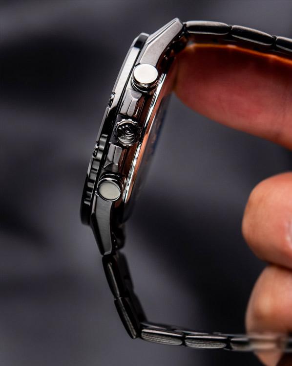 Часы оснащены водонепроницаемостью до 10 Бар, необритовым покрытием стрелок, функцией секундомера, циферблат защищен сапфировым стеклом.