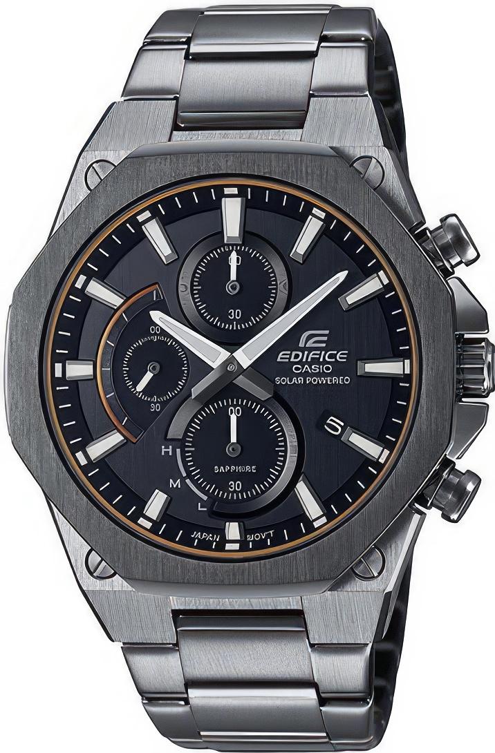 Спортивный хронограф с сапфировым стеклом. Черное покрытие корпуса и браслета. Питание от солнечных элементов. Стрелочный индикатор уровня заряда батареи.
