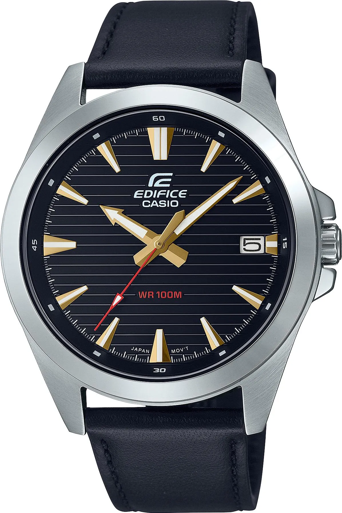 Мужские наручные часы Casio Edifice EFV-140L-1A. Точный кварцевый механизм с аналоговой индикацией. Корпус изготовлен из высококачественной нержавеющей стали 316L с высокими антикоррозийными свойствами. На стрелки и отметки нанесен светонакопительный состав, благодаря этому считывать информацию с циферблата возможно и в темноте. На циферблате отображается текущее число месяца. Аккумулятор обеспечивает часы достаточным питанием приблизительно на 3 года. Ремешок изготовлен из кожи. Прочное, устойчивое к царапинам минеральное стекло защищает часы от повреждений. Часы являются водонепроницаемыми до 10 Бар. Цвет корпуса: Серебристый. Цвет циферблата: Черный. Ширина (с заводной головкой): 49мм. Толщина: 11мм. Гарантия: 2 года. Другие наименования модели: EFV-140L-1AVUDF, EFV-140L-1AVUEF.