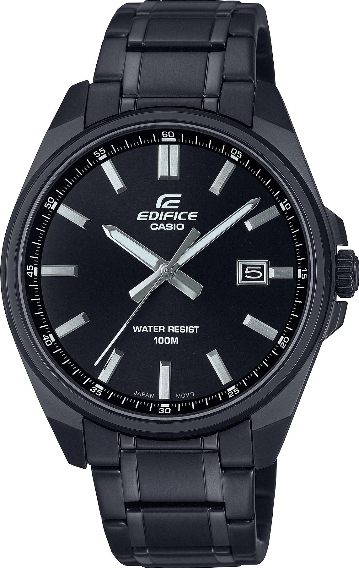 Мужские наручные часы Casio Edifice EFV-150DC-1A. Точный кварцевый механизм с аналоговой индикацией. Корпус изготовлен из высококачественной нержавеющей стали 316L с высокими антикоррозийными свойствами. На стрелки и отметки нанесен светонакопительный состав, благодаря этому считывать информацию с циферблата возможно и в темноте. На циферблате отображается текущее число месяца. Браслет из нержавеющей стали. Прочное, устойчивое к царапинам минеральное стекло защищает часы от повреждений. Часы являются водонепроницаемыми до 10 Бар. Цвет корпуса: Черный. Цвет циферблата: Черный. Ширина (с заводной головкой): 43мм. Толщина: 9мм. Гарантия: 2 года. Другие наименования модели: EFV-150DC-1AVUDF, EFV-150DC-1AVD.
