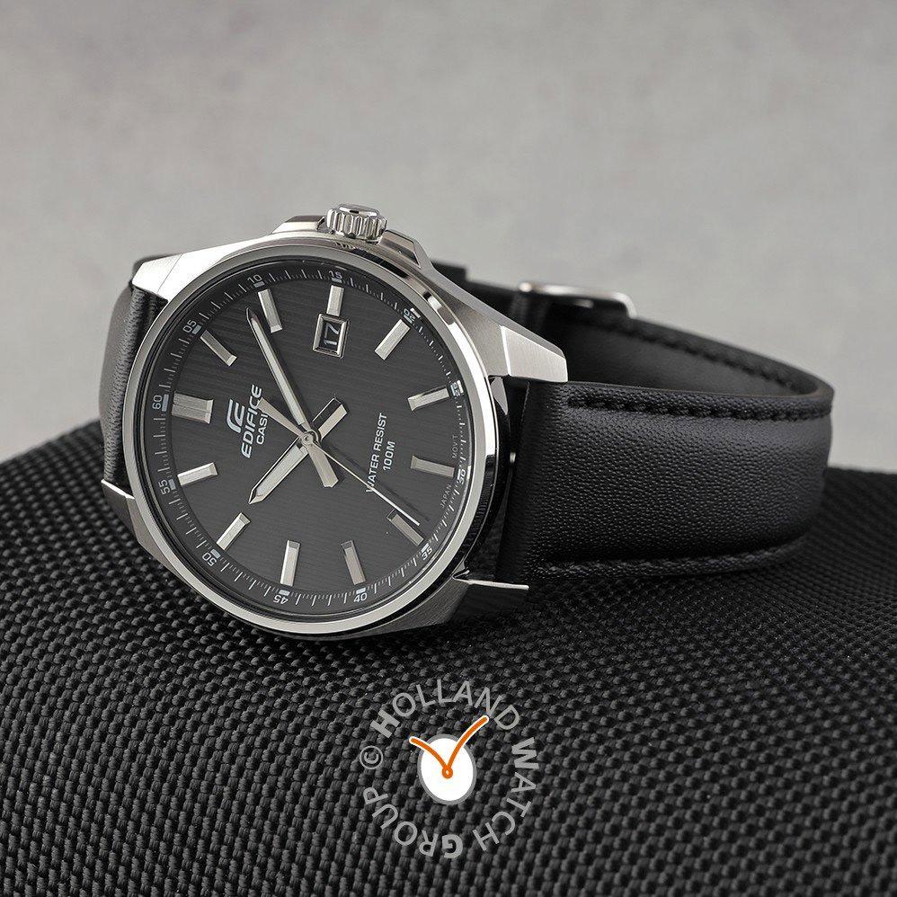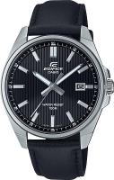 Мужские наручные часы Casio Edifice EFV-150L-1A. Точный кварцевый механизм с аналоговой индикацией. Корпус изготовлен из высококачественной нержавеющей стали 316L с высокими антикоррозийными свойствами. На стрелки и отметки нанесен светонакопительный состав, благодаря этому считывать информацию с циферблата возможно и в темноте. На циферблате отображается текущее число месяца. Ремешок изготовлен из кожи. Прочное, устойчивое к царапинам минеральное стекло защищает часы от повреждений. Часы являются водонепроницаемыми до 10 Бар. Цвет корпуса: Серебристый. Цвет циферблата: Черный. Ширина (с заводной головкой): 43мм. Толщина: 9мм. Гарантия: 2 года. Другие наименования модели: EFV-150L-1AVUDF, EFV-150L-1AVD.