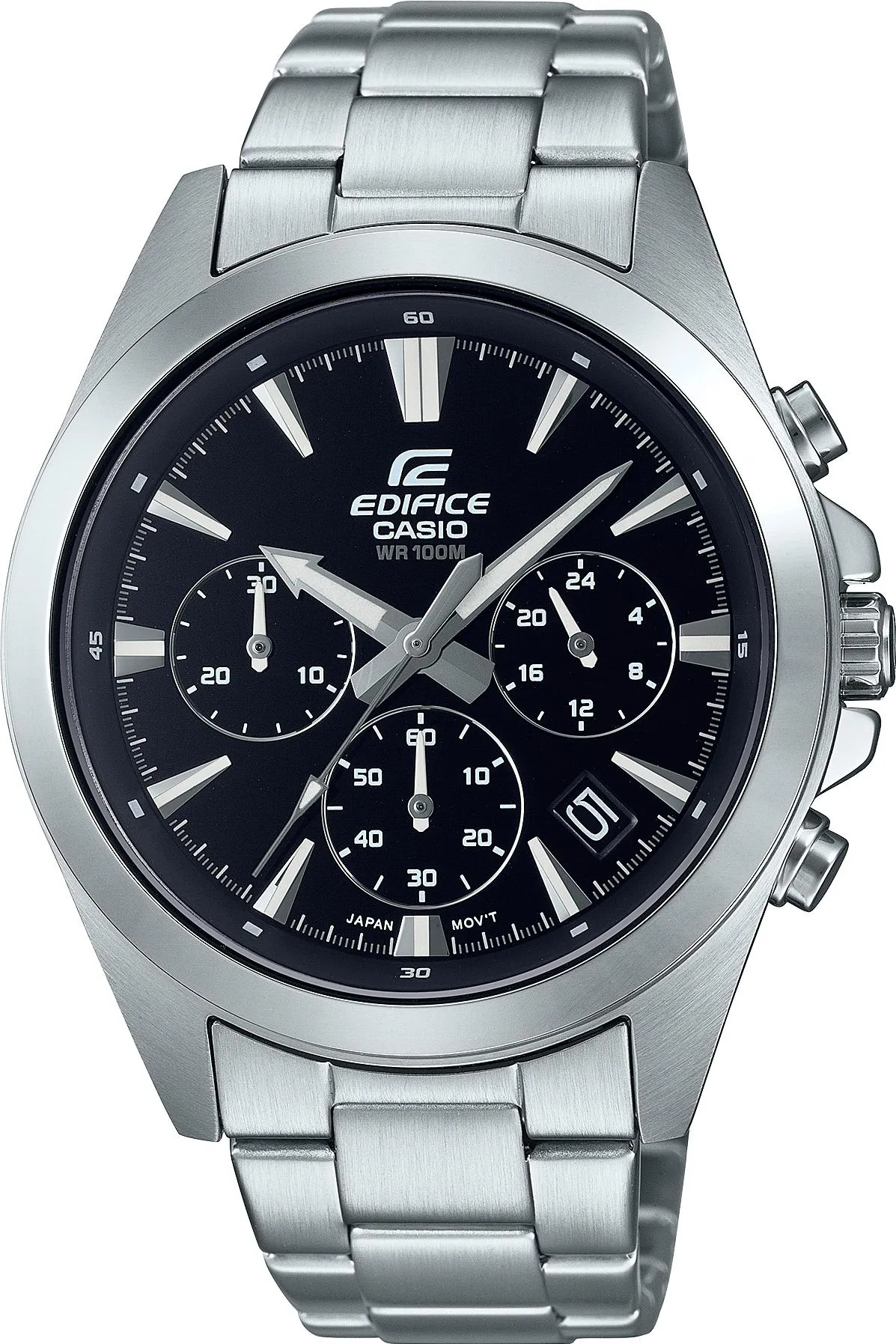 Мужские наручные часы Casio Edifice EFV-630D-1A. Точный кварцевый механизм с аналоговой индикацией. Корпус изготовлен из высококачественной нержавеющей стали 316L с высокими антикоррозийными свойствами. На стрелки и отметки нанесен светонакопительный состав, благодаря этому считывать информацию с циферблата возможно и в темноте. На циферблате отображается текущее число месяца. Функция хронографа. Аккумулятор обеспечивает часы достаточным питанием приблизительно на 3 года. Браслет из нержавеющей стали. Прочное, устойчивое к царапинам минеральное стекло защищает часы от повреждений. Часы являются водонепроницаемыми до 10 Бар. Цвет корпуса: Серебристый. Цвет циферблата: Черный. Ширина (с заводной головкой): 49мм. Толщина: 11мм. Гарантия: 2 года. Другие наименования модели: EFV-630D-1AVUDF.