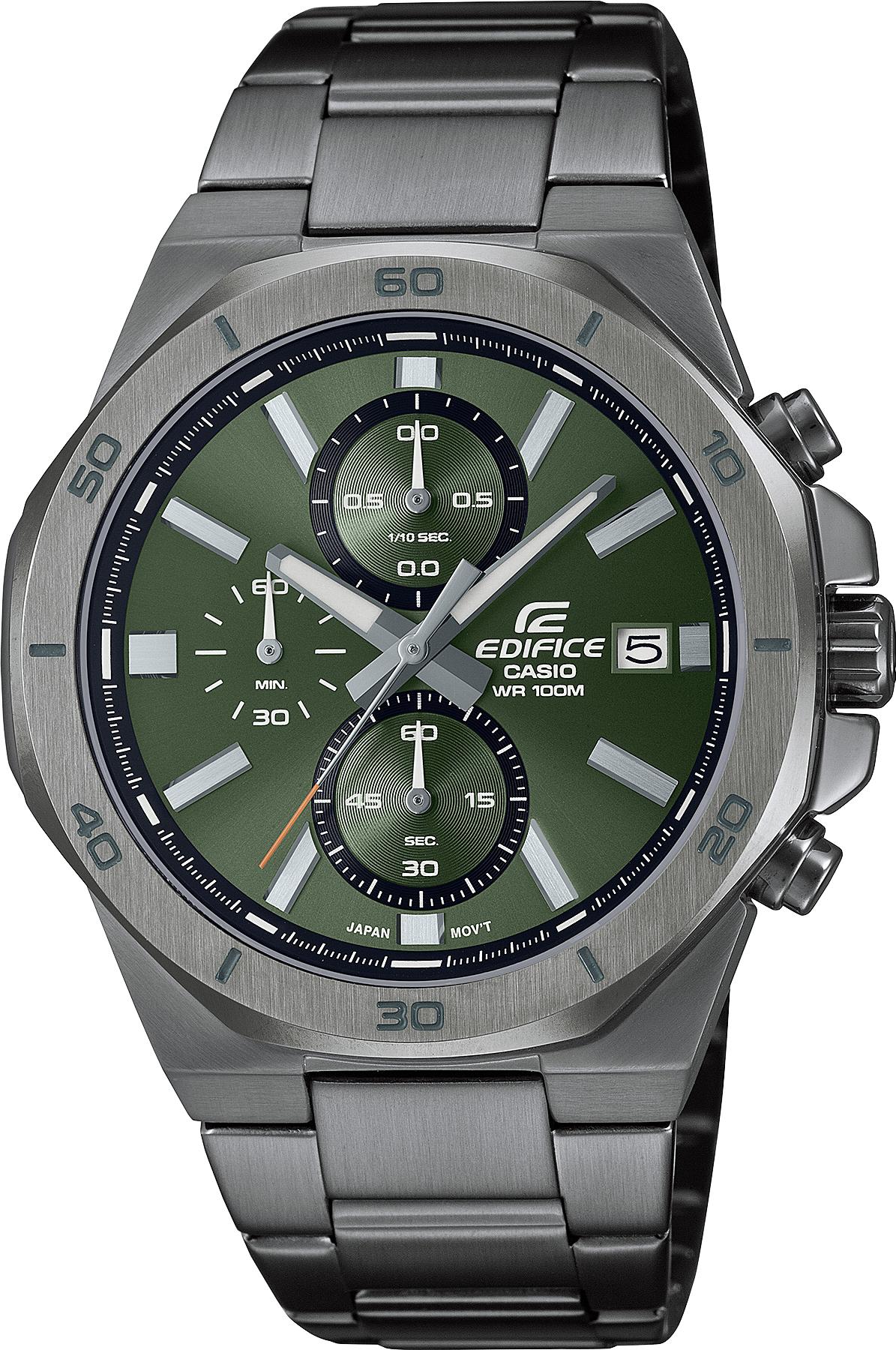 Мужские наручные часы Casio Edifice EFV-640DC-3A. Точный кварцевый механизм с аналоговой индикацией. Корпус изготовлен из высококачественной нержавеющей стали 316L с высокими антикоррозийными свойствами. На стрелки и отметки нанесен светонакопительный состав, благодаря этому считывать информацию с циферблата возможно и в темноте. На циферблате отображается текущее число месяца. Функция хронографа. Аккумулятор обеспечивает часы достаточным питанием приблизительно на 2 года. Отображение времени возможно в 12-часовом или 24-часовом формате. Браслет из нержавеющей стали. Прочное, устойчивое к царапинам минеральное стекло защищает часы от повреждений. Часы являются водонепроницаемыми до 10 Бар. Цвет корпуса: Черный. Цвет циферблата: Зеленый. Ширина (с заводной головкой): 47мм. Толщина: 11мм. Гарантия: 2 года. Другие наименования модели: EFV-640DC-3AVUDF.
