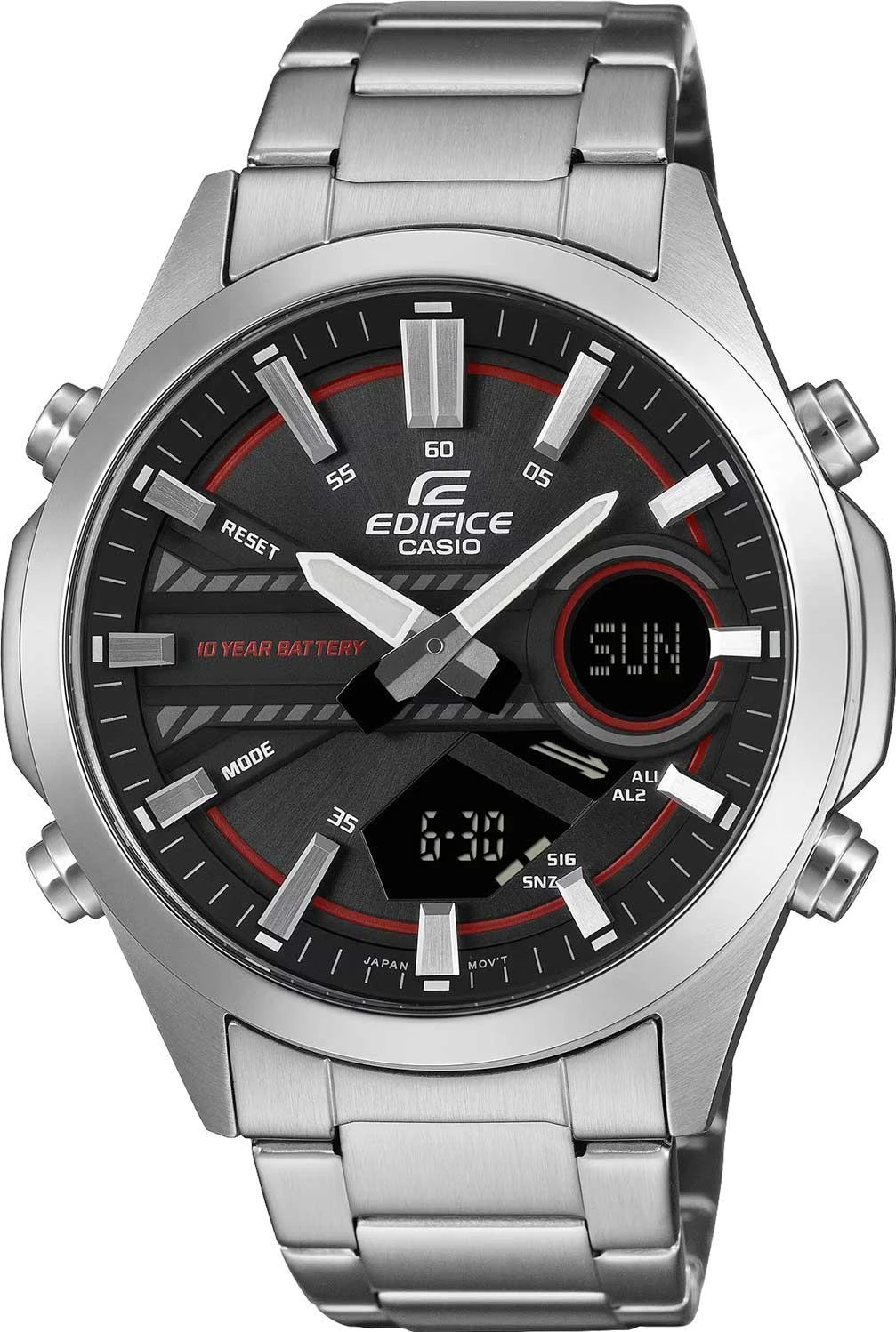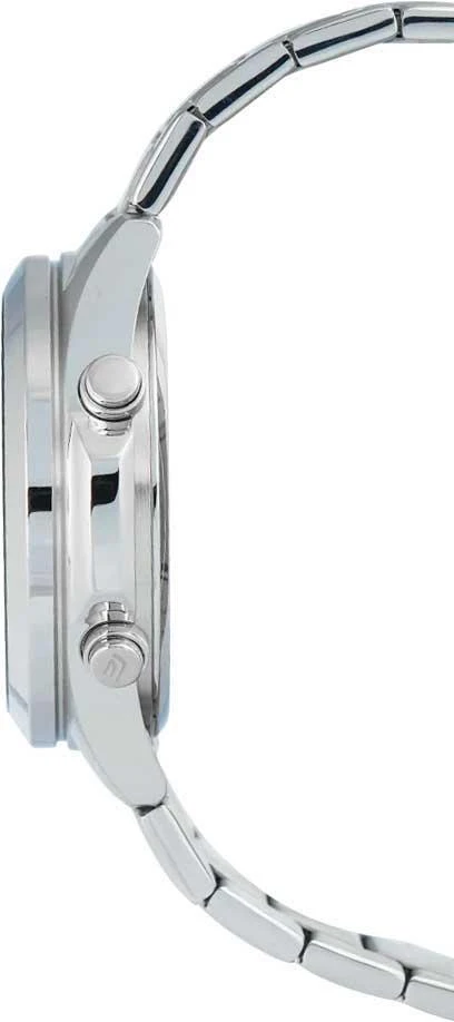 Мужские многофункциональные часы с поддержкой 12-ти и 24-х часового формата. Оснащены точным секундомером (1/100с, измерение до 24ч) с функцией SPLIT-хронографа, таймером обратного отсчета от 1 минуты до 24 часов и мировым временем для 30 городов (29 часовых поясов) с опцией летнего времени. Встроенная записная книжка на 30 ячеек позволяет сохранять контакты (8 букв и 16 цифр в каждой записи). Циферблат с метками-штрихами выполнен по технологии Sunray, создающей эффект солнечных лучей. Батареи хватает на 10 лет эксплуатации. Часы дополнены браслетом с тройной раскладывающейся застежкой, которая расстегивается одним касанием.